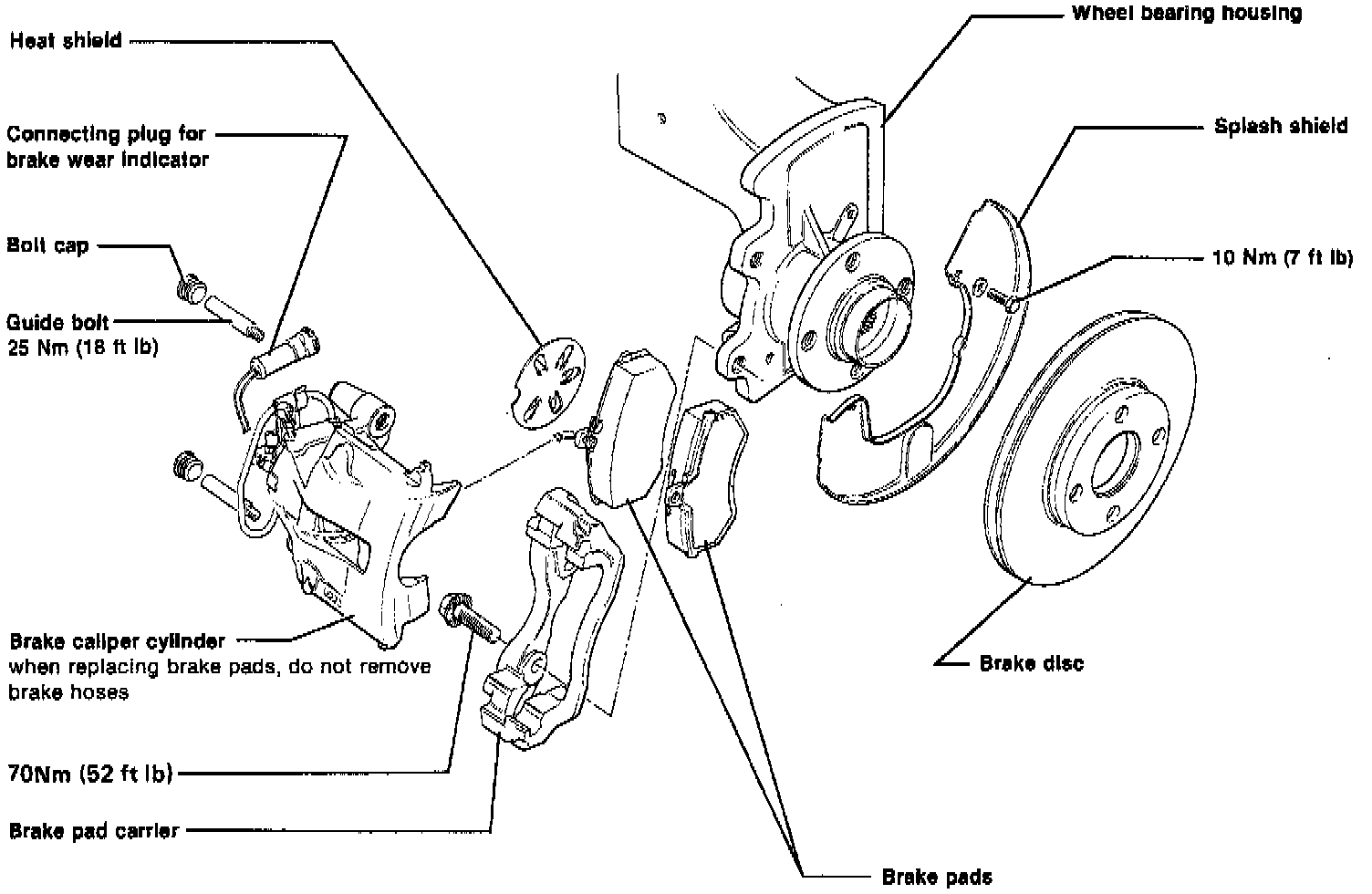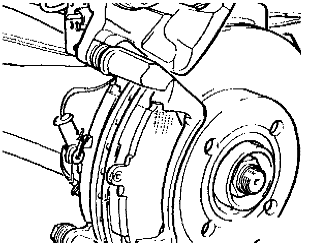 Disconnect brake hoses only when replacing or servicing calipers. When detaching but not removing brake calipers, do not remove hoses. Hang calipers on frame.