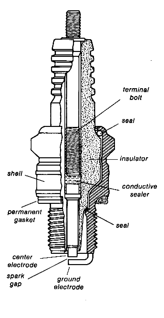 Timed pulses of 10,000 - 20,000 volts from the ignition coil arc between the spark plug electrodes to ignite the fuel/air mixture near the end of each compression stroke.