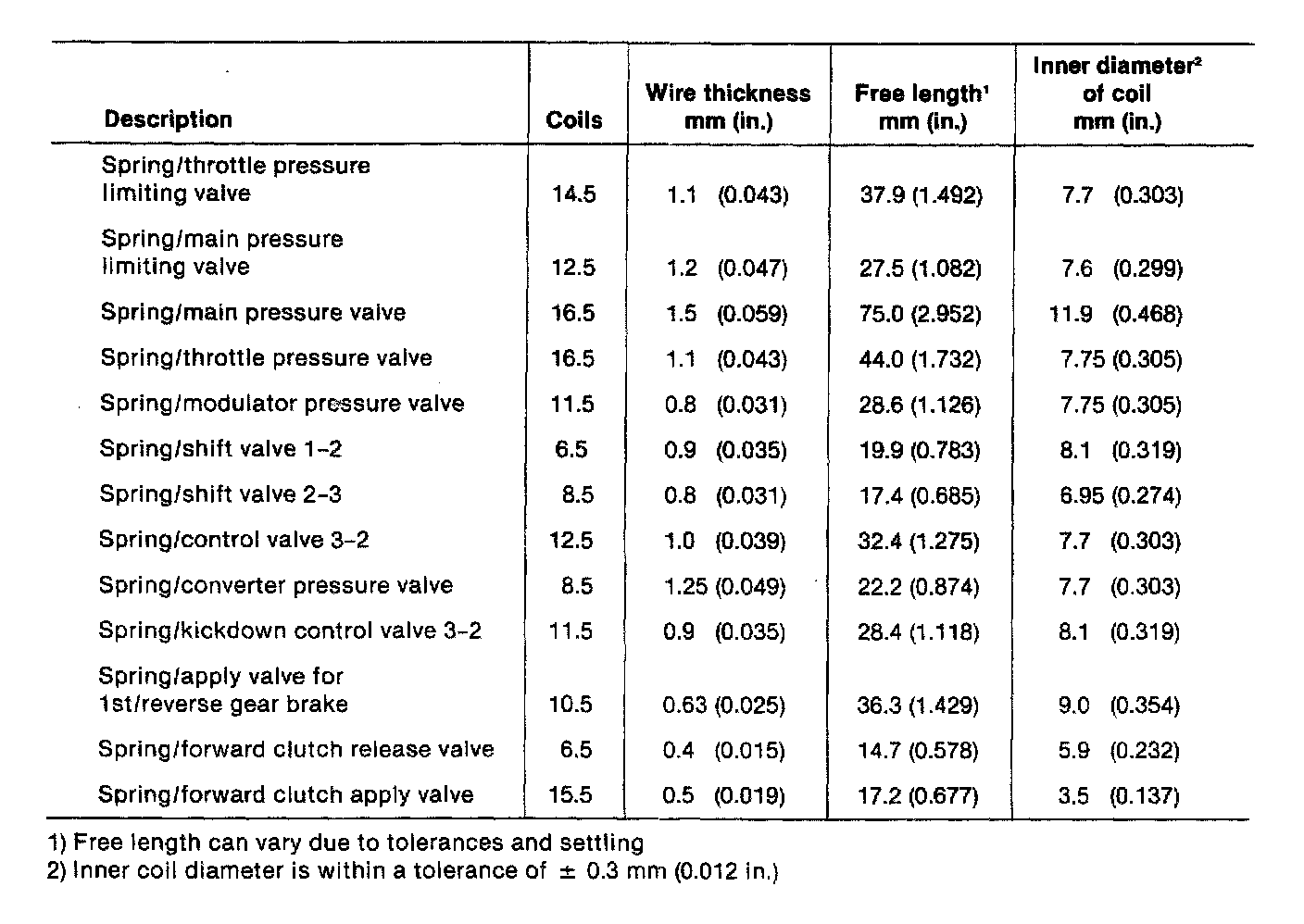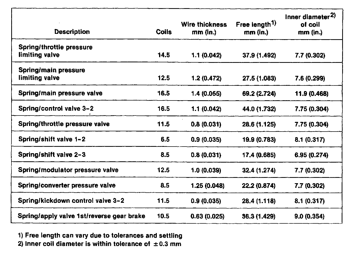 A/T Type 087, Valve Body Spring Table: