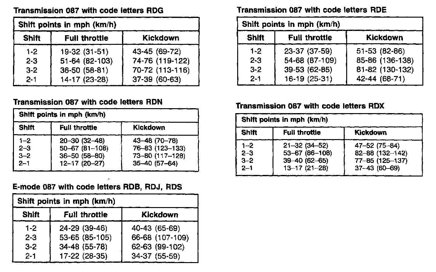 A/T Type 087 & 087 E-mode, Shift Points: