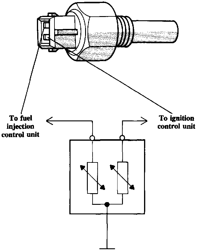The coolant temperature sensor consists of two NTC resistors within one housing. One resistor provides information on engine coolant temperature to the ignition control unit. The second resistor provides the same information to the fuel injection control unit.