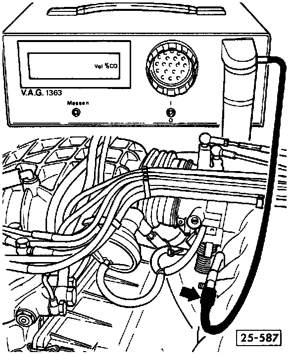 - connect hose from exhaust gas analyzer (Sun 105 or EPA equivalent) to CO measuring tap (arrow)