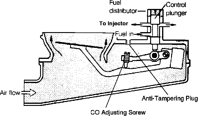 An adjustment screw (accessible through a hole in the top of the sensor housing with the anti-tampering plug removed) is used to change the position of the control plunger relative to the sensor plate. This adjusts the basic fuel mixture by raising or lowering the control plunger while the sensor plate remains in the same position.