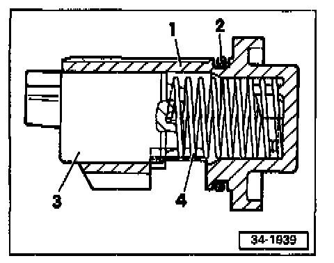 - Compress spring with bushing -3-, tighten approx. one turn counterclockwise (to left) until lug on bushing -3- is positioned above groove in plastic bushing.