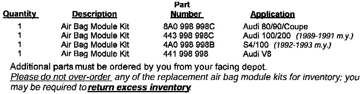 Prior to owner notification, we will automatically ship to you an initial supply of replacement air bag sensor module kits based on your vehicle allocation. The parts are as follows: