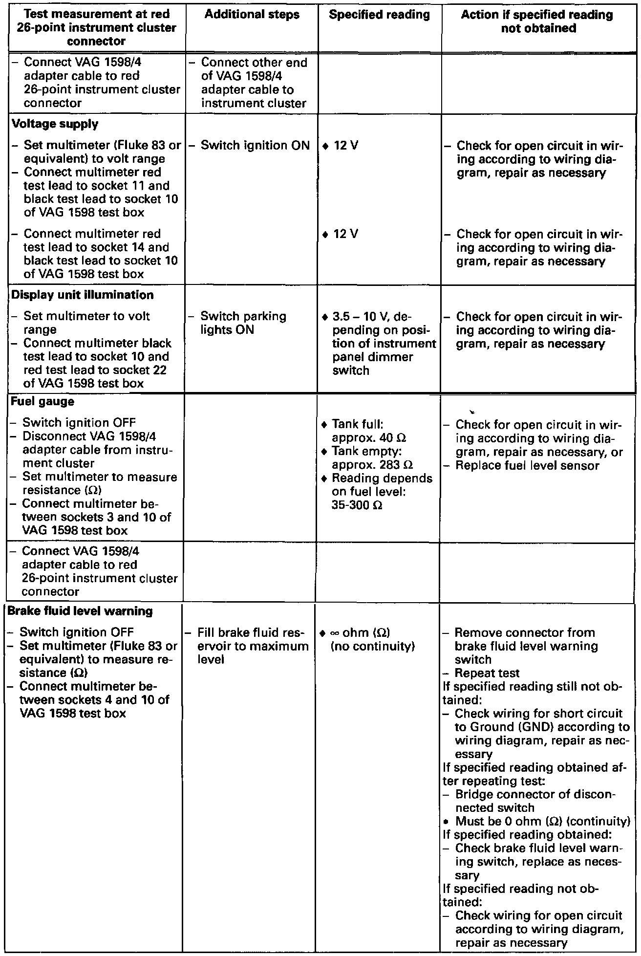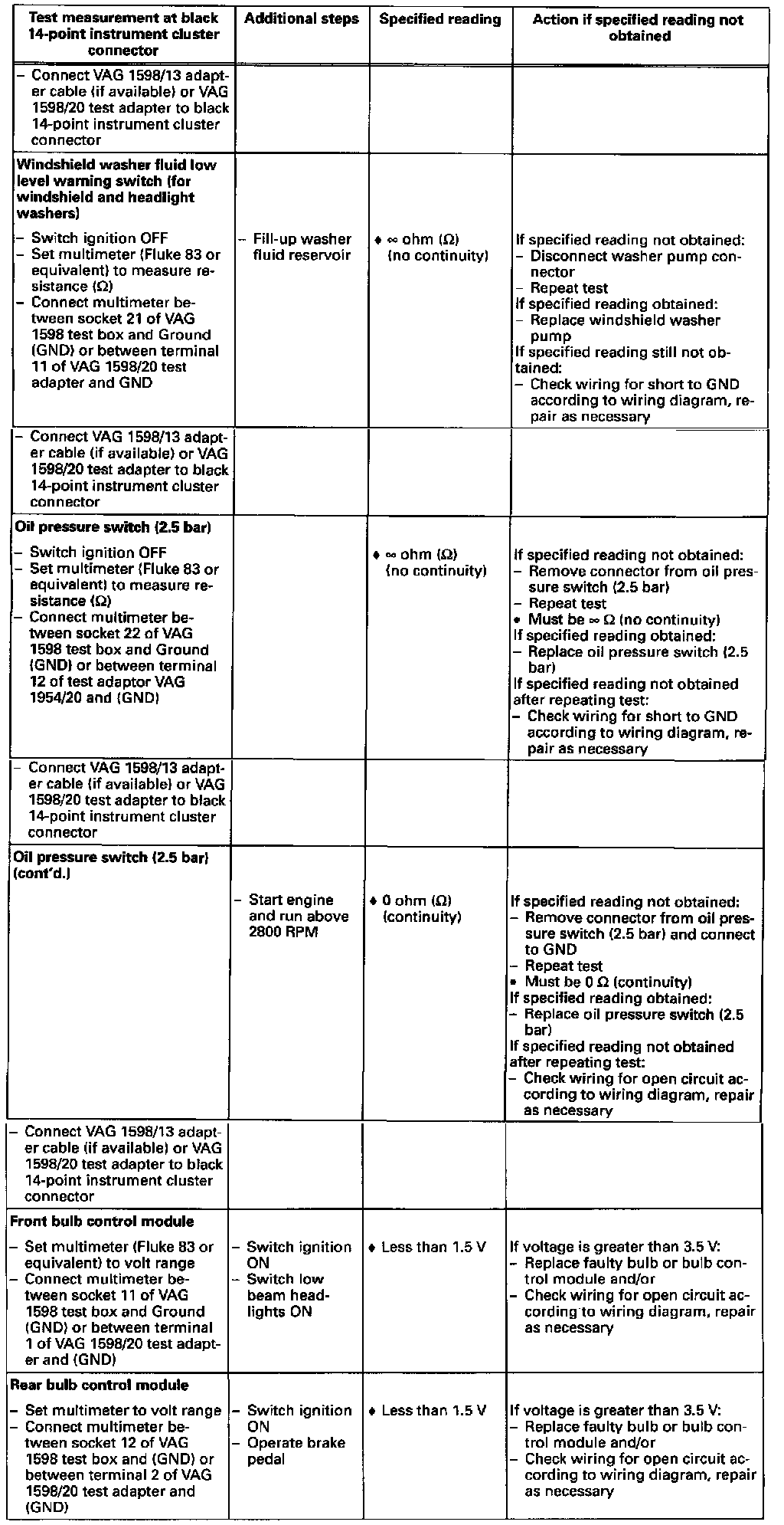 - Use digital multimeter (Fluke 83 or equivalent), connector test kit VW 1594, VAG 1598 test box, VAG 1598/4 adapter cable and VAG 1598/20 test adapter when performing electrical checks