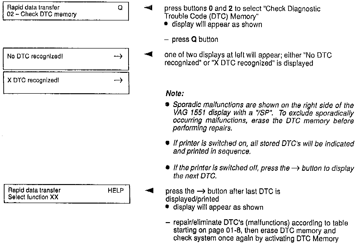 ^ Sporadic malfunctions are shown on the right side of the VAG 1551 display with a "/SP". To exclude sporadically occuring malfunctions, erase the DTC memory before performing repairs.
