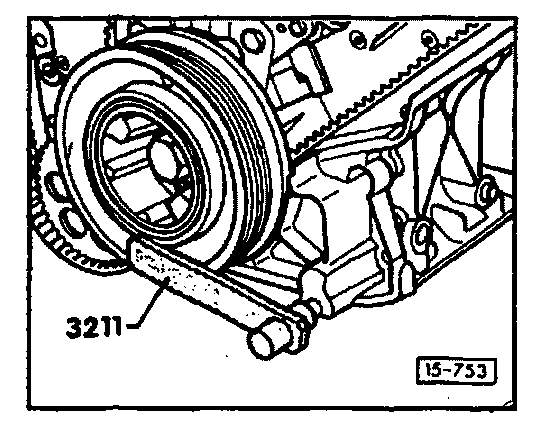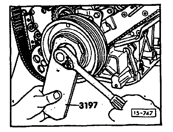 Note: If there is NO hole in the vibration damper to accept special tool VAG 3211 you MUST manually ensure that the TDC mark on the vibration damper is aligned with the TDC pointer BEFORE AND AFTER tightening the camshaft sprockets.