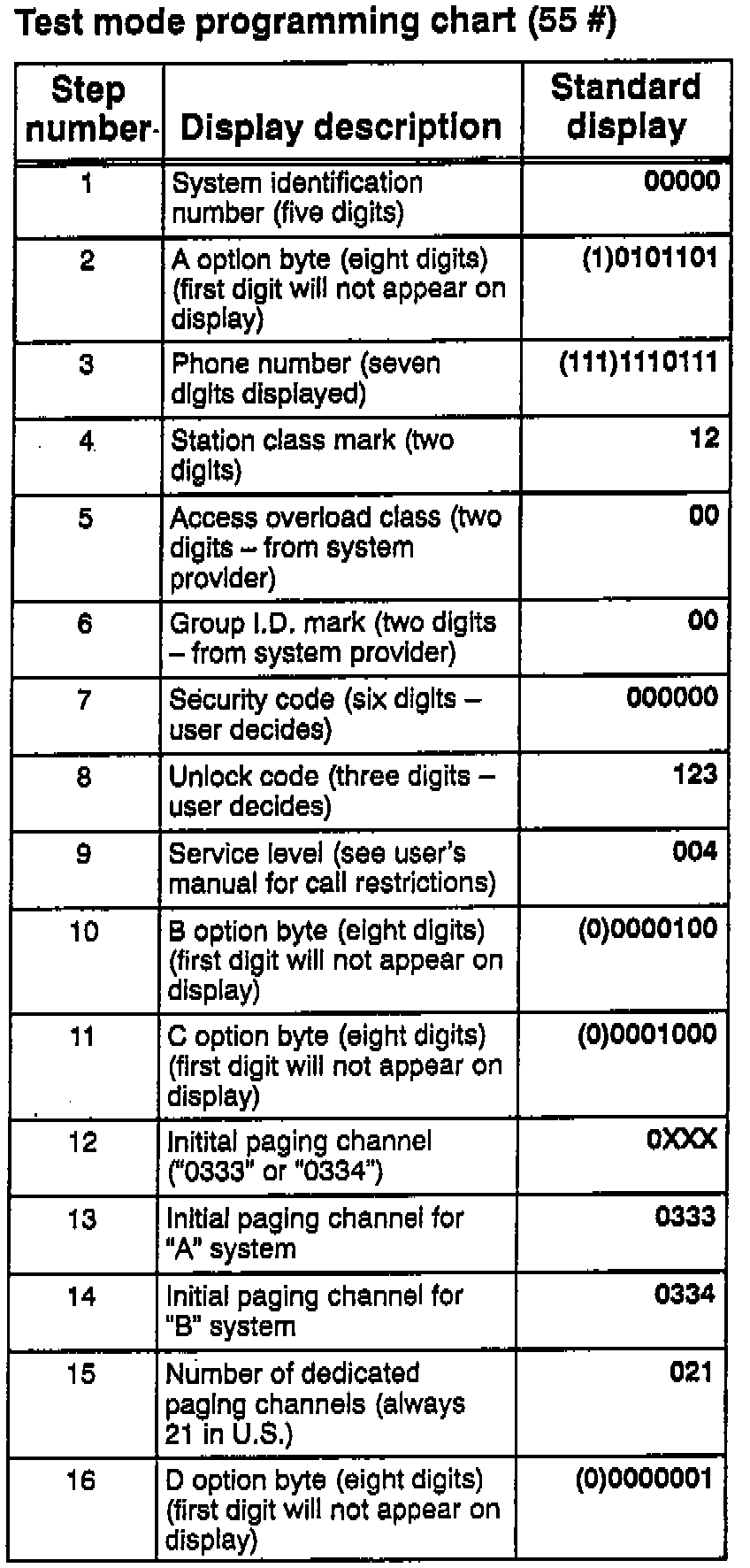 Sixteen different steps, each containing telephone programming information, can be displayed during this test mode. See illustrated chart.