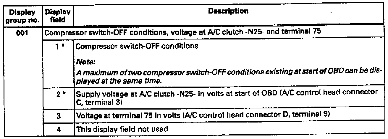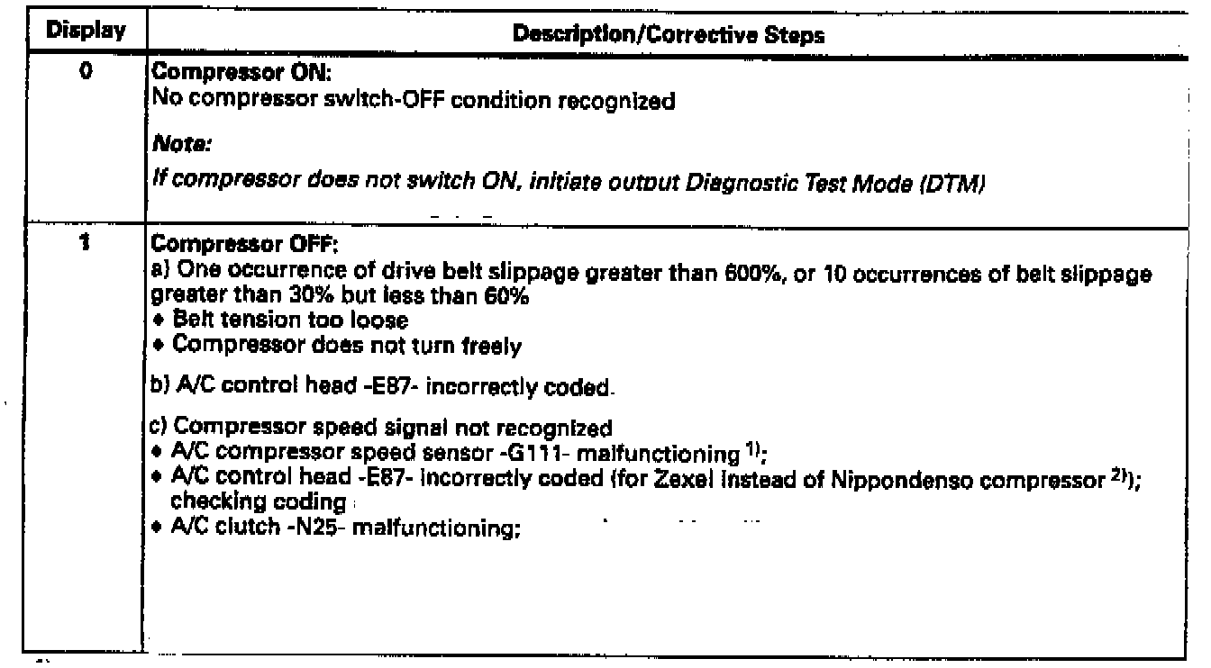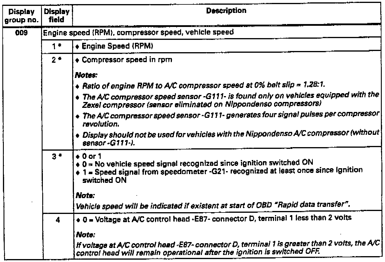 During m.y. 1996, a Nippondenso A/C compressor was installed as a running change on vehicles with 6-cylinder engines. On this compressor the A/C compressor speed sensor -G111- has been ellminated. All display groups and display fields shown were are valid for both Zexel and Nippondenso compressors unless otherwise noted.