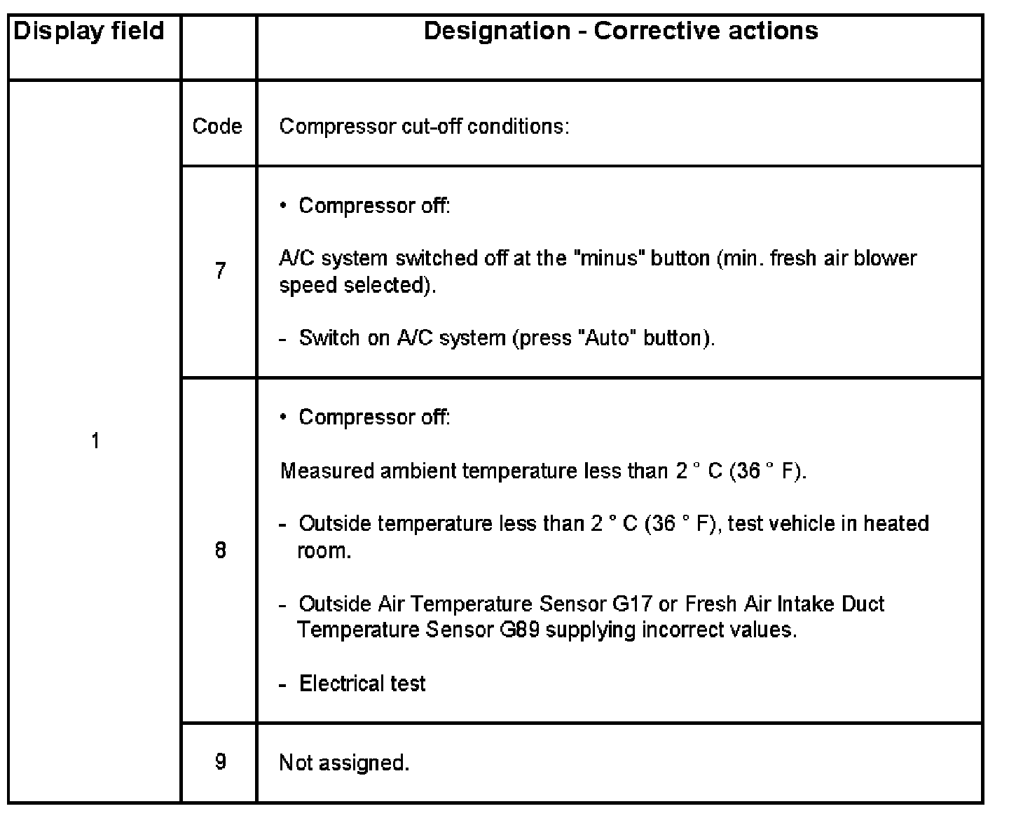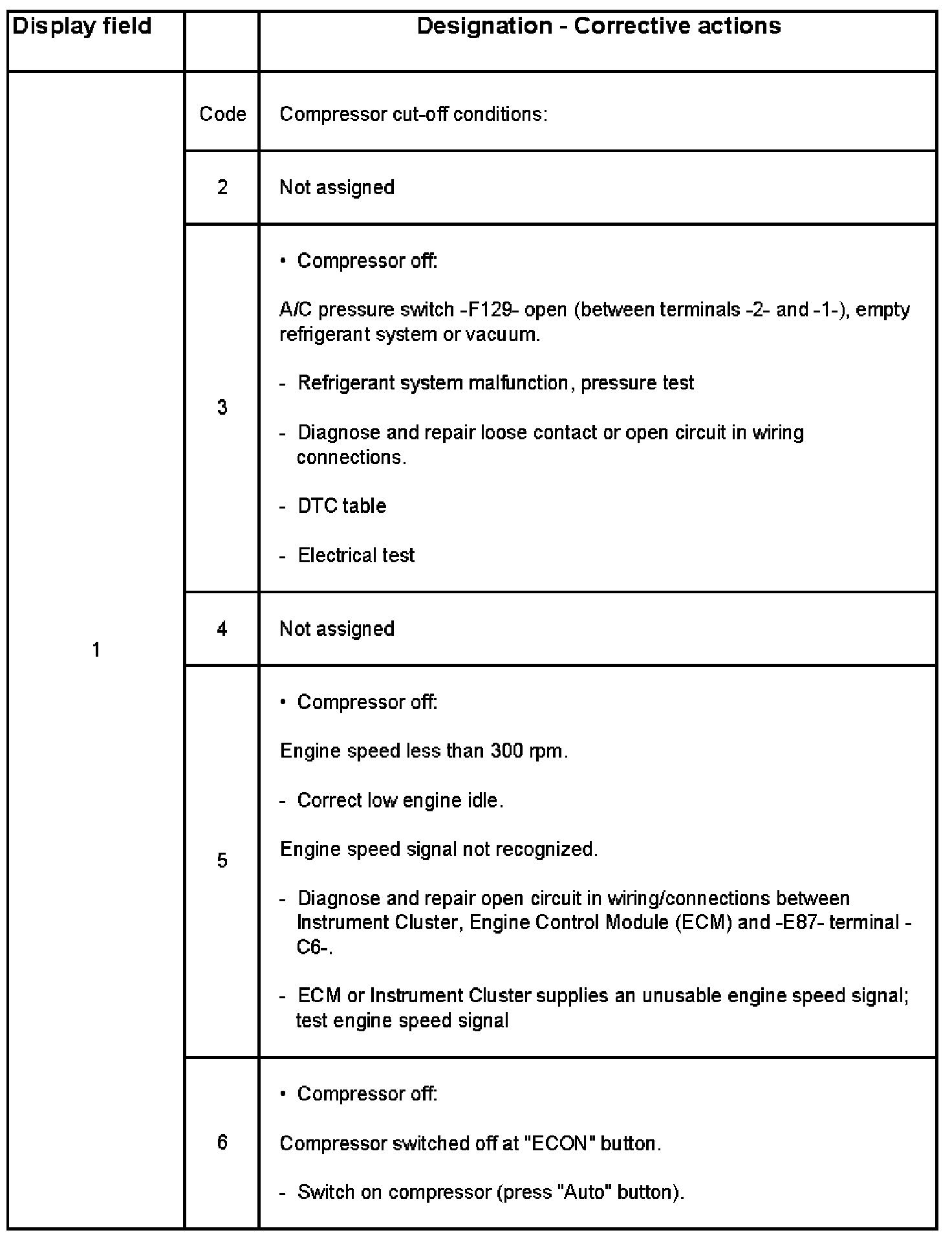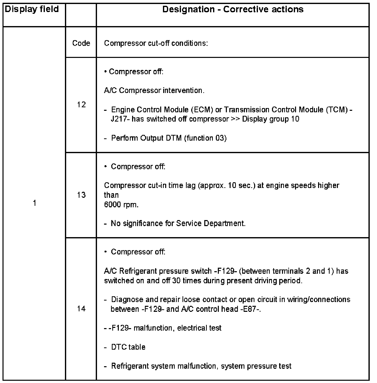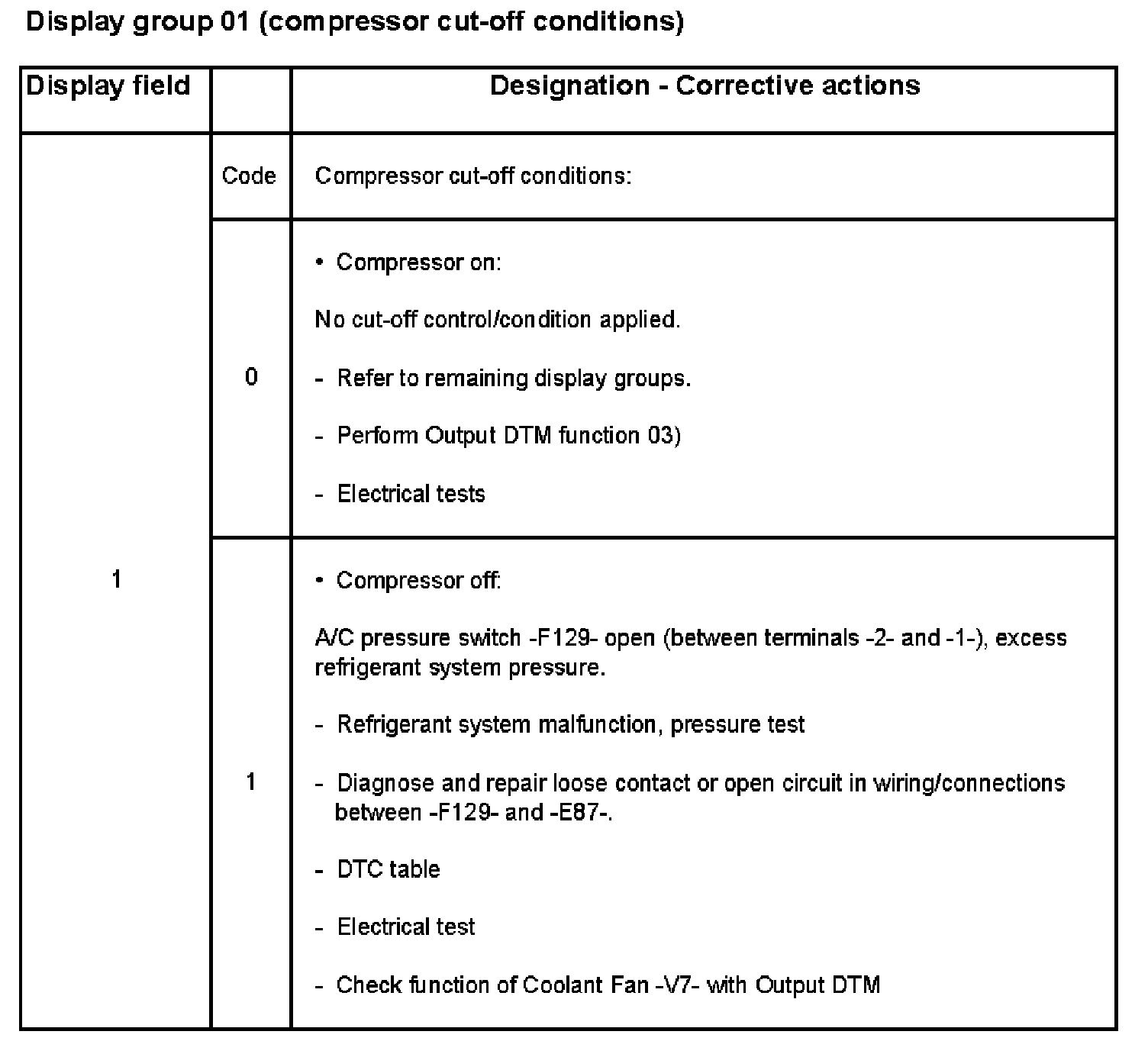 - When display field 1 shows compressor cut-off condition codes 1, 8, 11 or 12, the A/C Clutch -N25- cannot be actuated during Output DTM. If compressor cut-off condition code 5 appears in addition to other compressor cut-off conditions, ignore code 5. Output Diagnostic Test Mode (DTM) (Function 03)