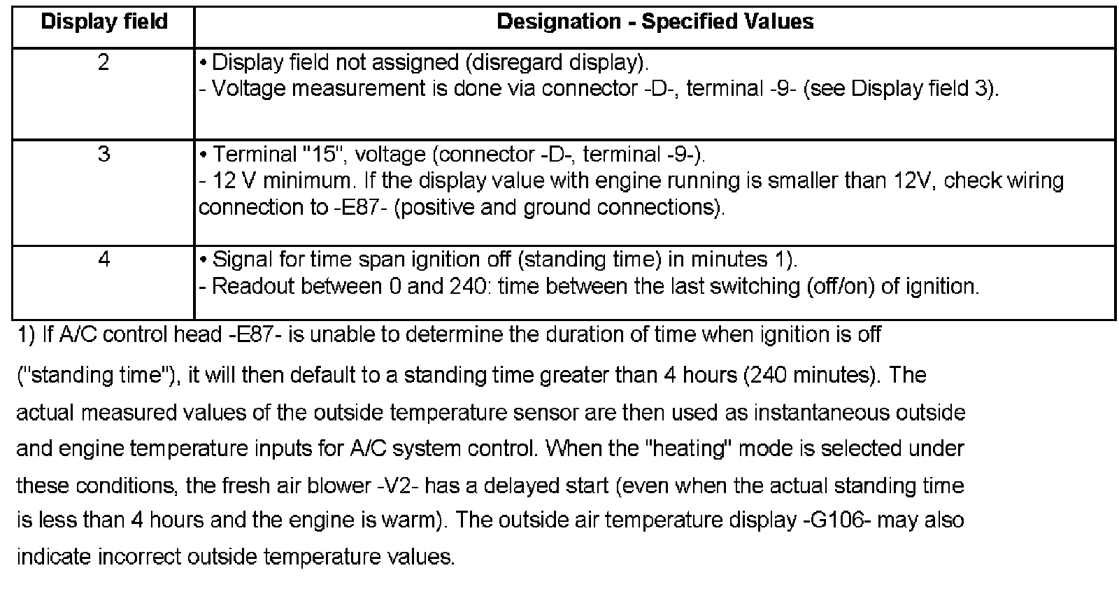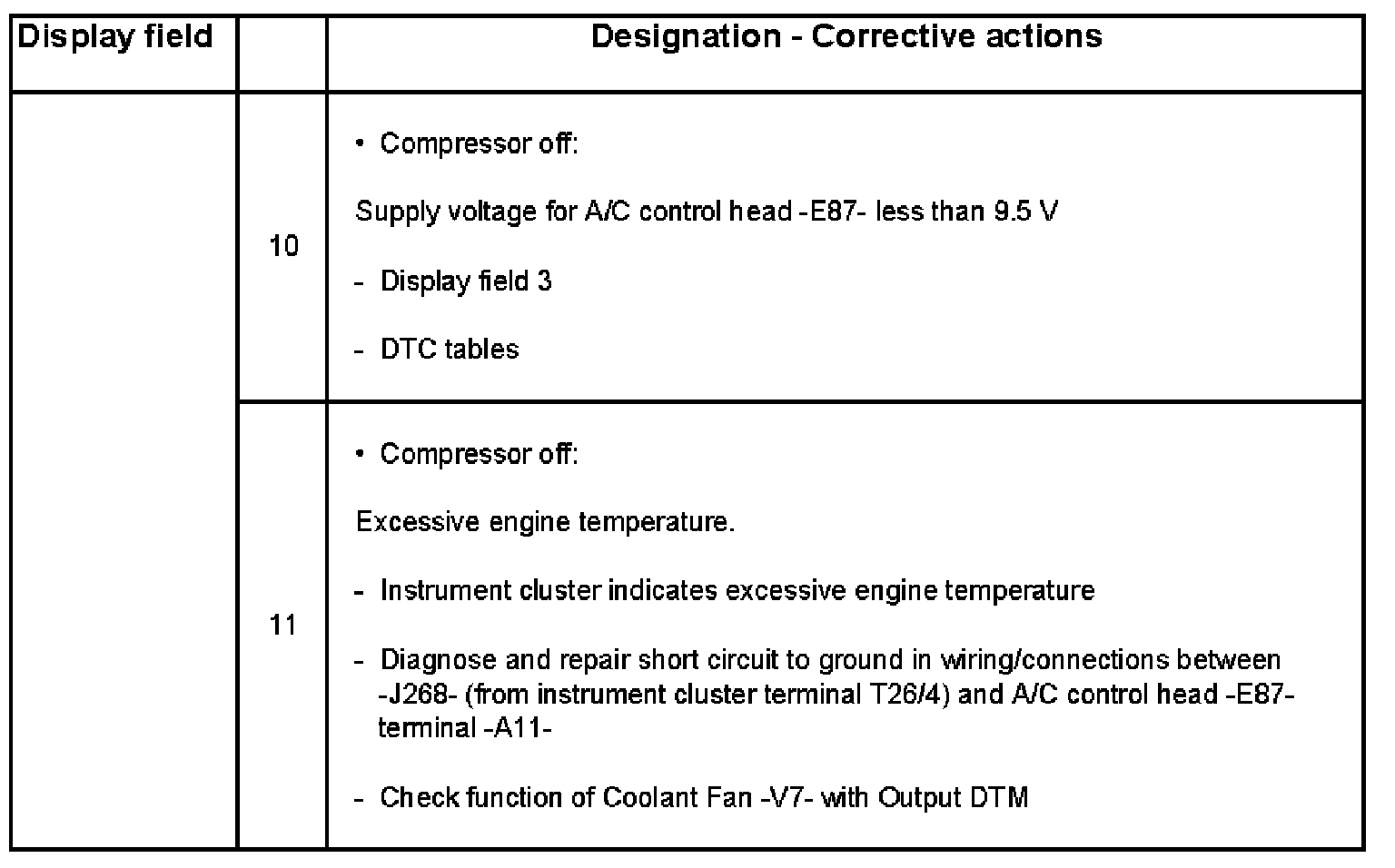 - If several compressor cut-off condition codes appear simultaneously in display field 1, conditions are displayed alternately or the cut-off condition assigned the highest priority by A/C control head -E87- is displayed.