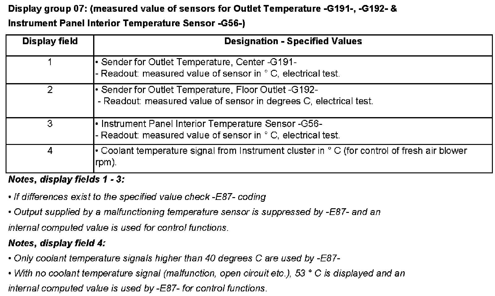 Display group 07: (measured value of sensors for Outlet Temperature -G191-, -G192- & Instrument Panel Interior Temperature Sensor -G56-)