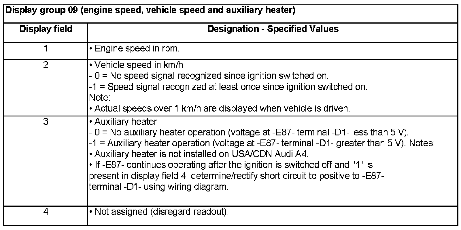 Display group 09 (engine speed, vehicle speed and auxiliary heater)