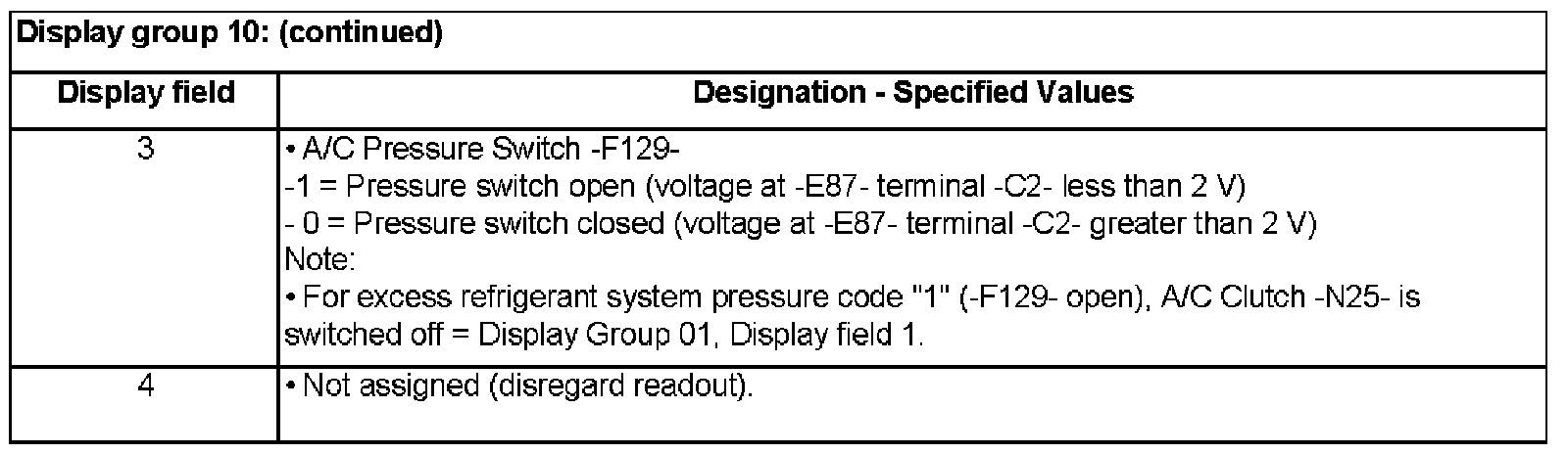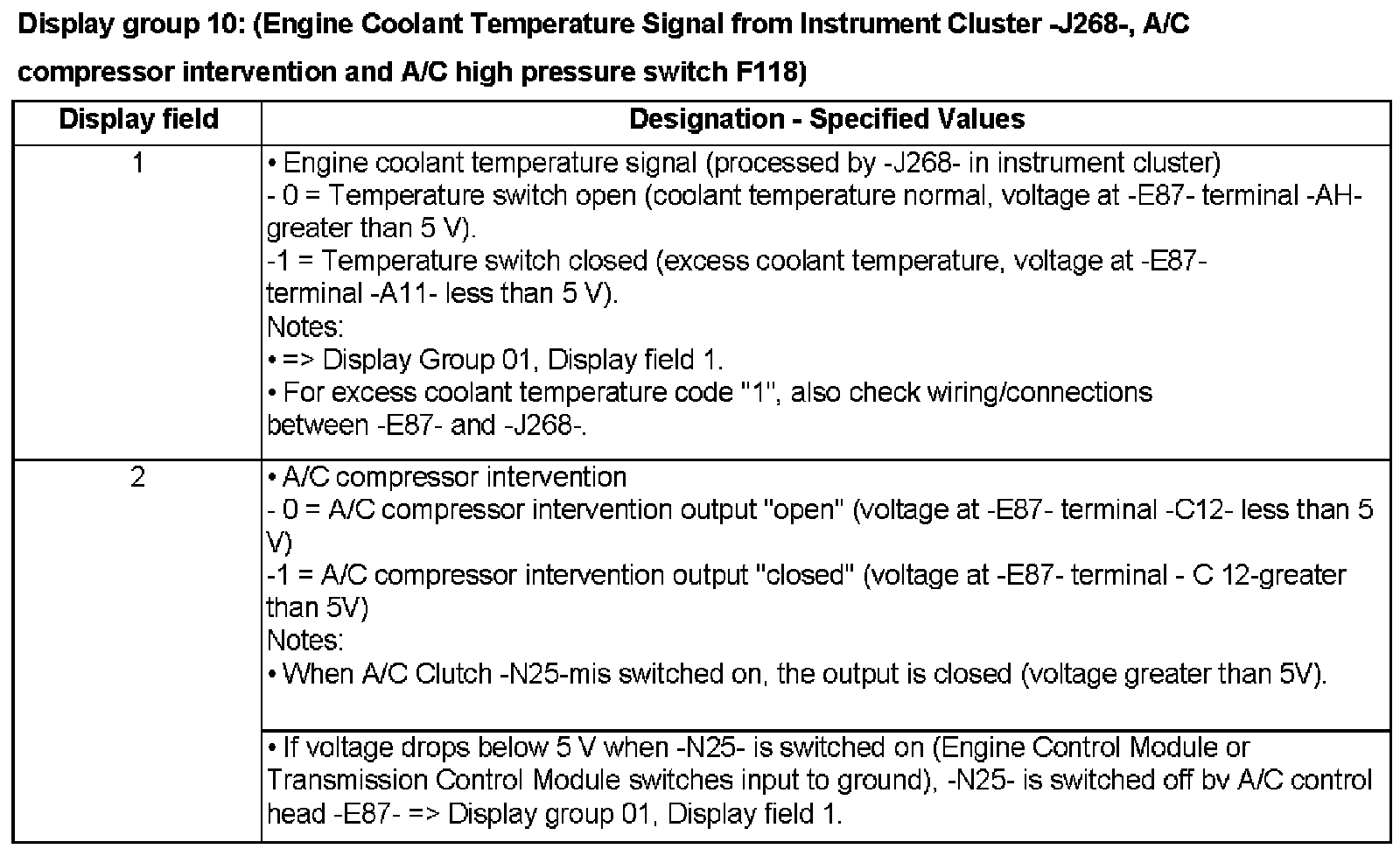 Display group 10: (Engine Coolant Temperature Signal from Instrument Cluster -J268-, A/C compressor intervention and A/C high pressure switch F118)