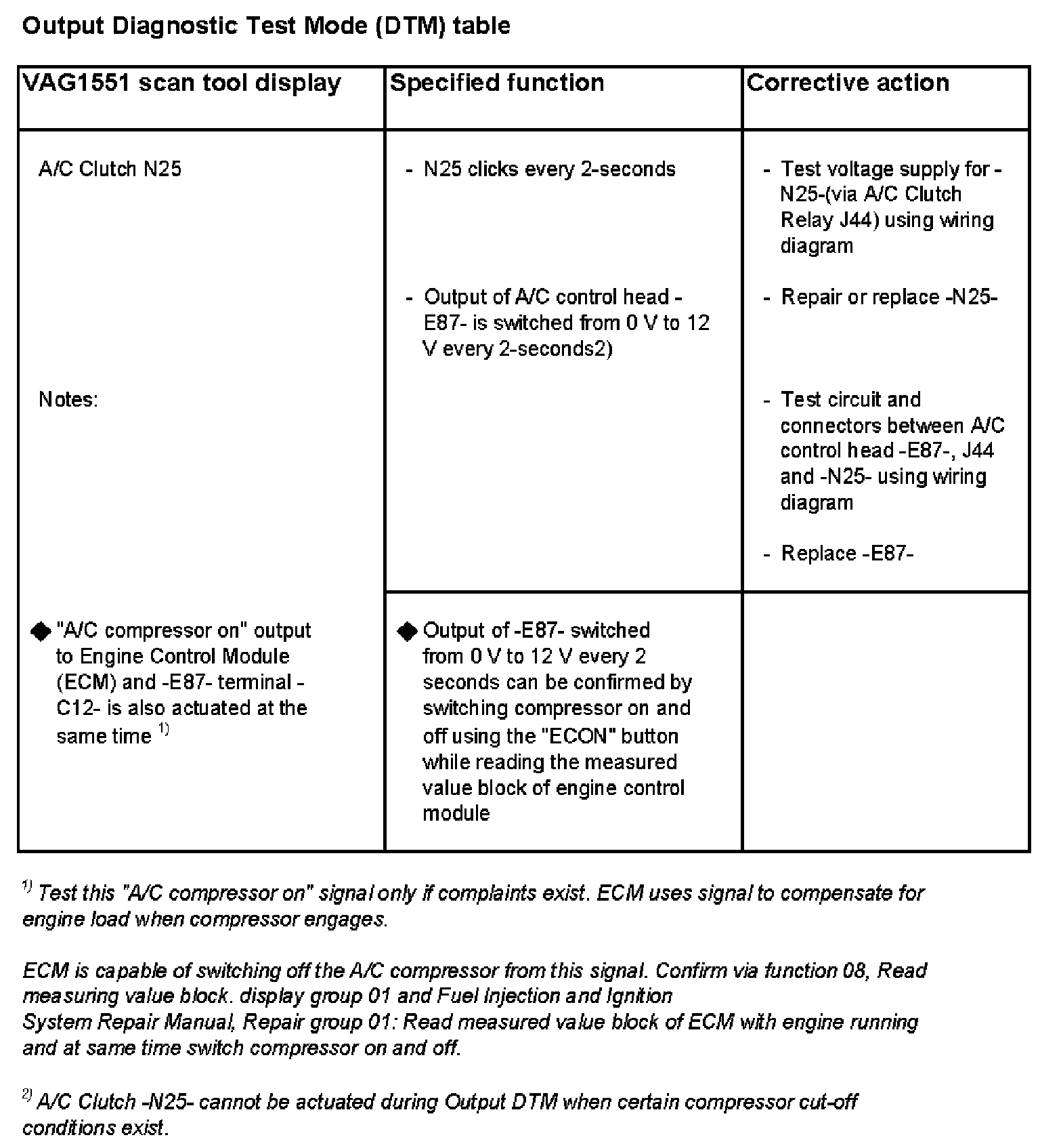 - During Output DTM on vehicles with Control Head (E87) Part Number 8D0 820 043 D, A/C Compressor Clutch (N25) DTC "01270, mechanical malfunction SP" may be stored even though no malfunction is present. Corrective action: When output DTM is complete, check DTC memory. If above DTC is present, erase DTC memory.
