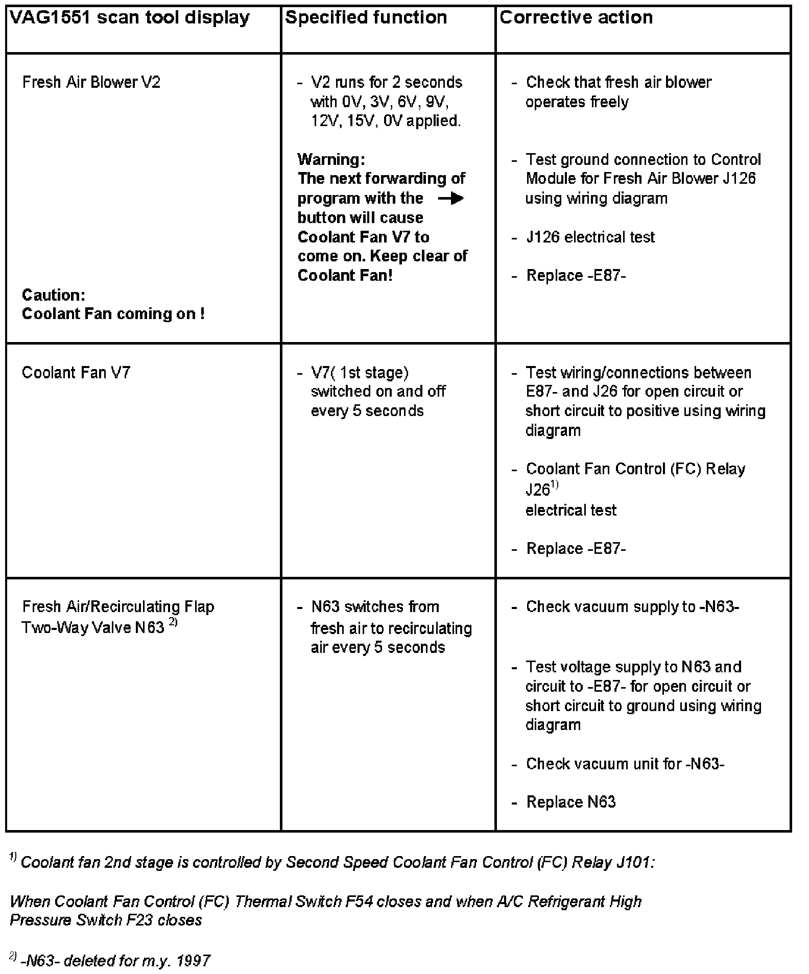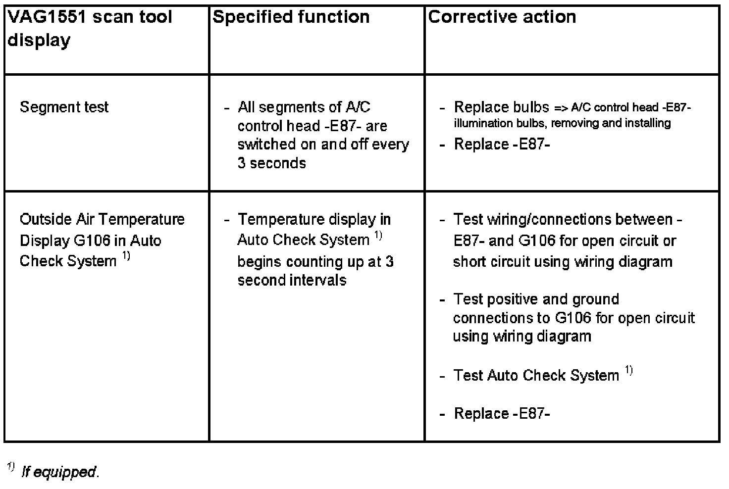 Output DTM allows functional checking of A/C control head actuated components (DTM components). Actuators receive output signals generated by the control head via VAG1551 Scan Tool (ST) in sequence. Function is confirmed in accordance with specified responses.
