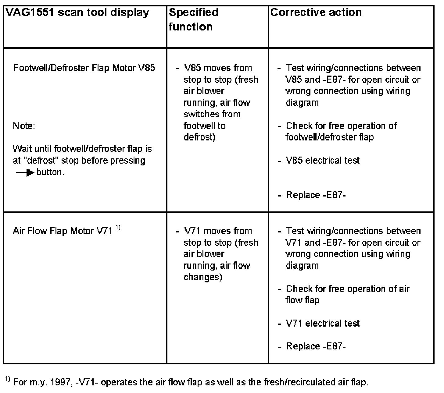 - When starting Output DTM, temperature and air distribution flap flap motors move to predetermined positions in preparation for individual tests: Temperature Regulator Flap Motor V68: moves to "heat" position. Central Air Flap Motor -V70- moves to "floor & defroster outlet" position. Footwell Defroster Flap Motor V85 moves to "defrost" position.