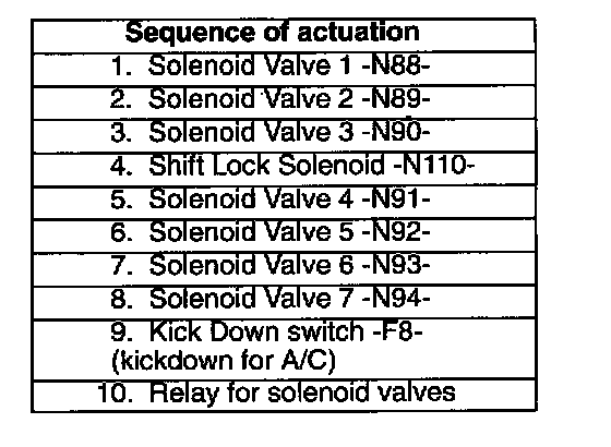 - The operation of the Solenoid Valves 1 -N88-, 2 -N89- and 3 -N90- and the shift lock solenoid are checked audibly during Output Diagnostic Test Mode. Avoid background noises when performing the audible check as the switching noise (clicking) of the final control elements is very quiet.