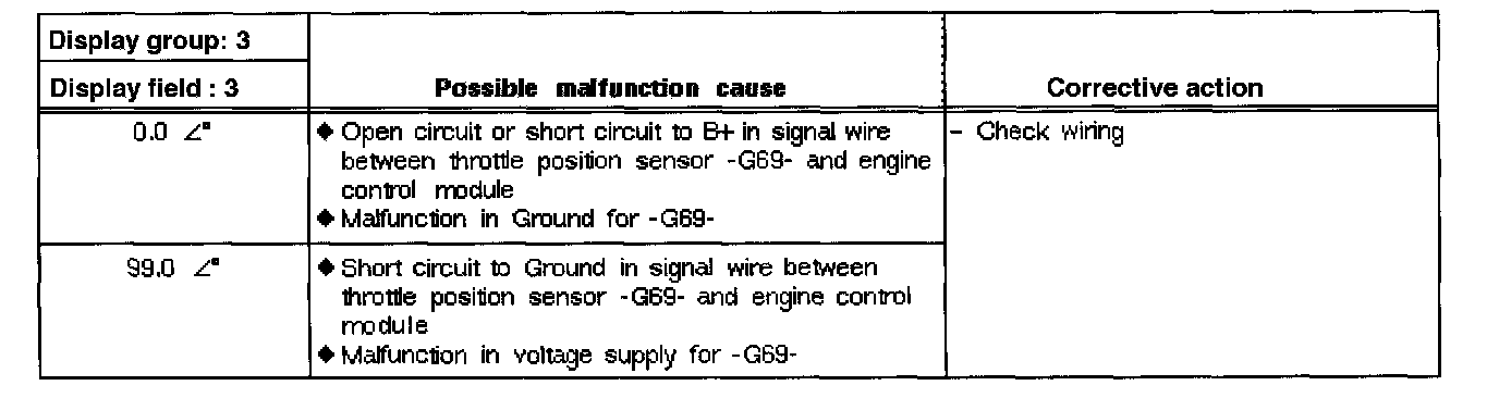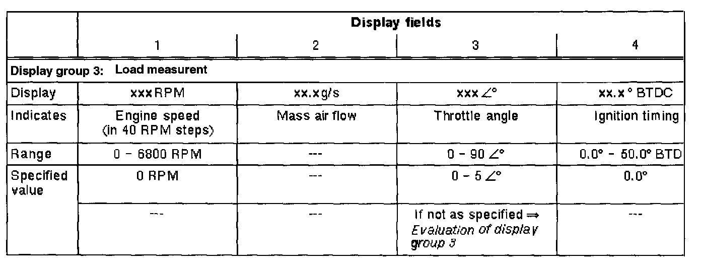 NOTE: The values displayed in display field 3 depend on the calibration of the Throttle Position (TP) sensor and do not correspond with the actual throttle valve opening in degrees. The maximum displayed value is 90.0°.
