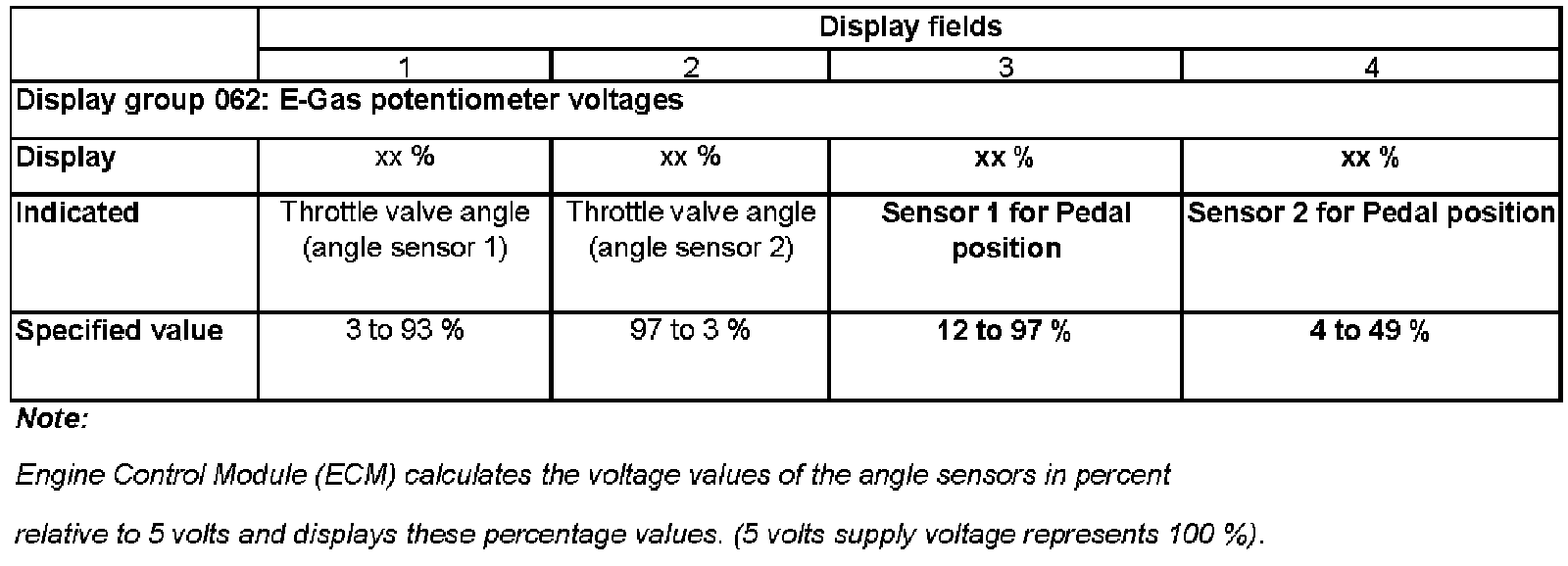 - Check specified values for E-gas potentiometer voltages in display fields 3 and 4.