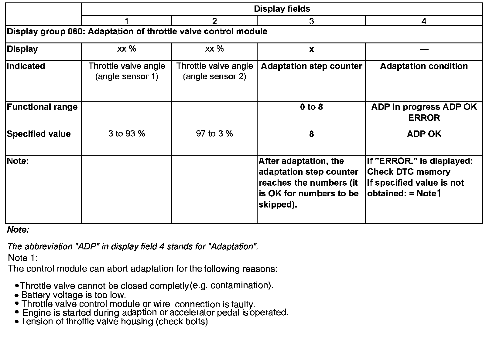 The adaptation teaches the Engine Control Module (ECM) various positions of the throttle valve when the ignition is on and the engine is stopped. These positions are stored in the control module The return communication regarding the position of the throttle valve occurs via the two angle sensors for throttle drive.