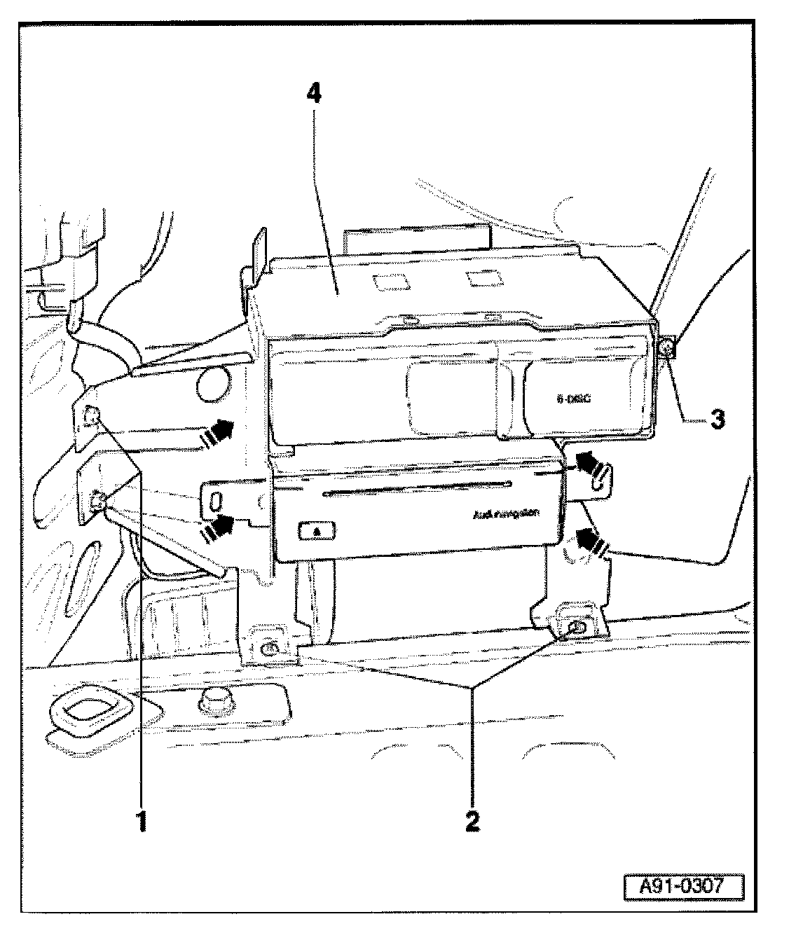 - When disconnecting harness connectors, unscrew both mounting screws (arrows) on left and right of control module for navigation with CD-mechanism -J401-, and remove it from the carrier -4-.