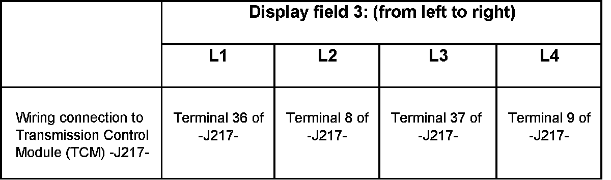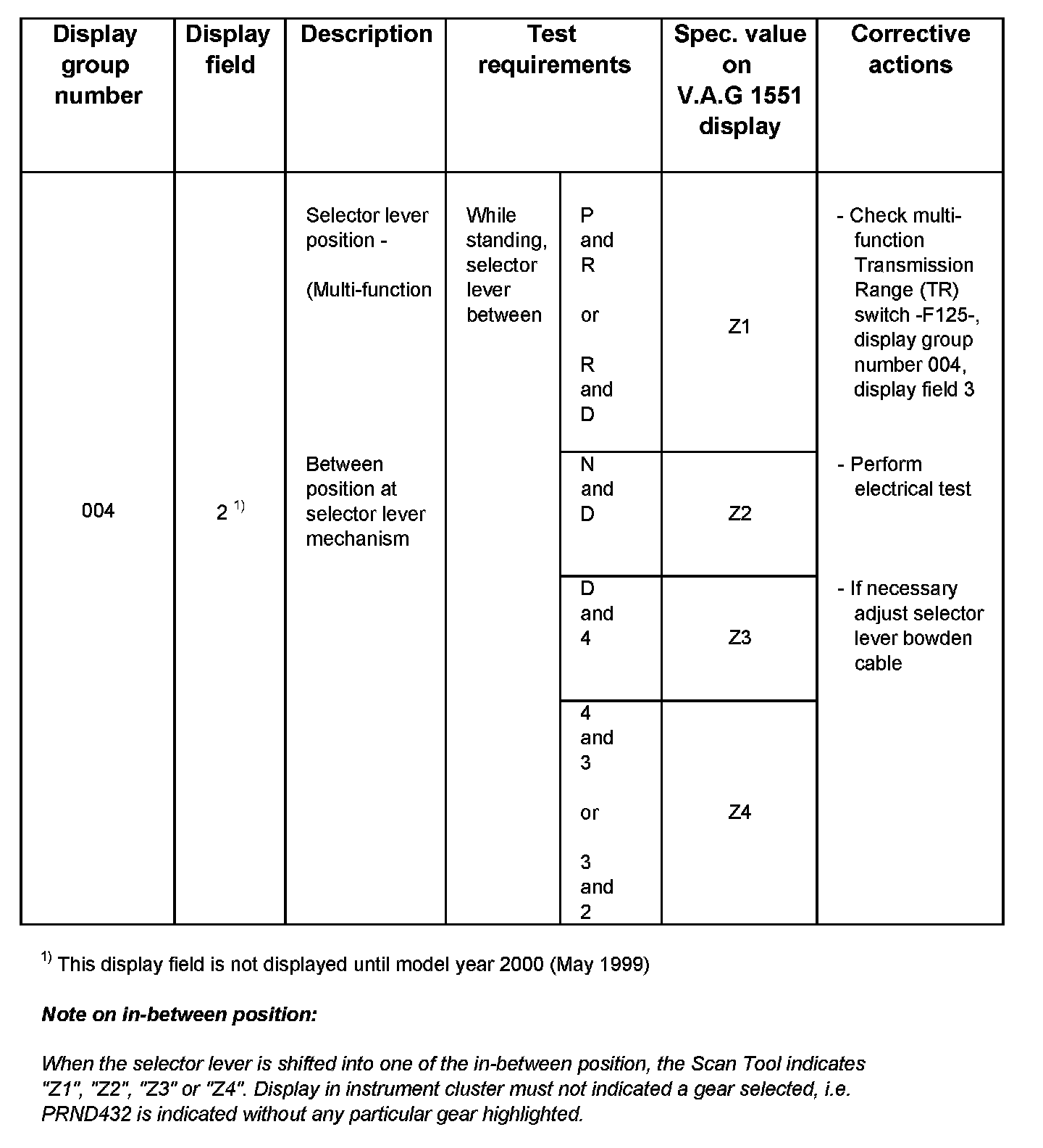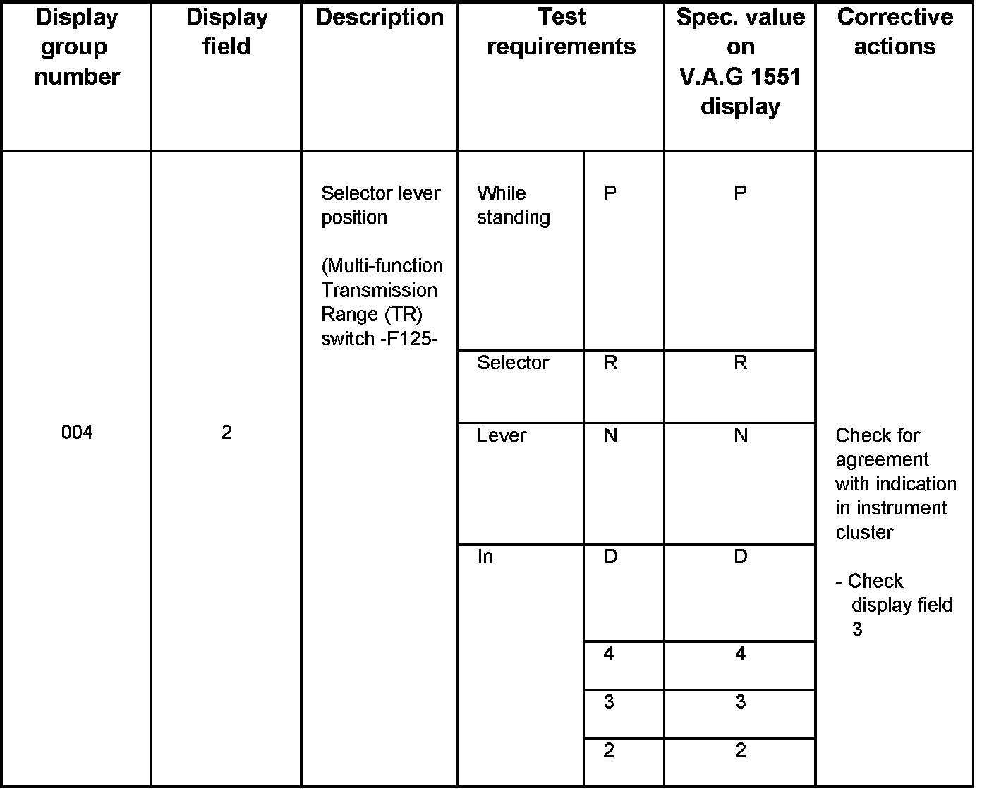 The input signals of the Multi-function Transmission Range (TR) switch -F125- can be checked at the Transmission Control Module (TCM).