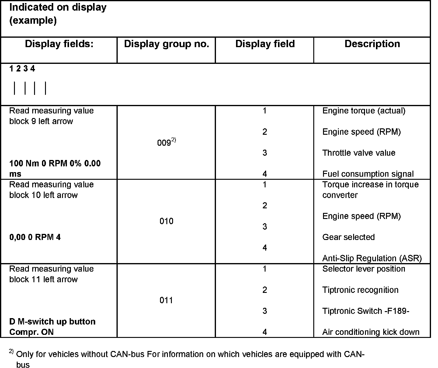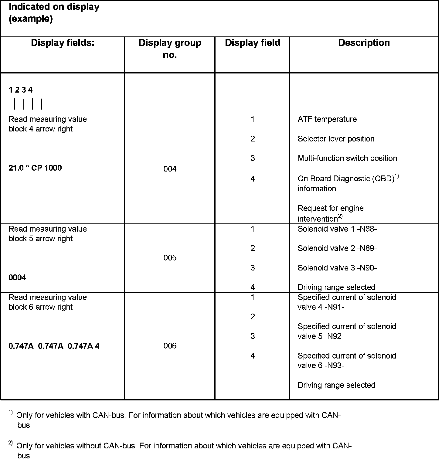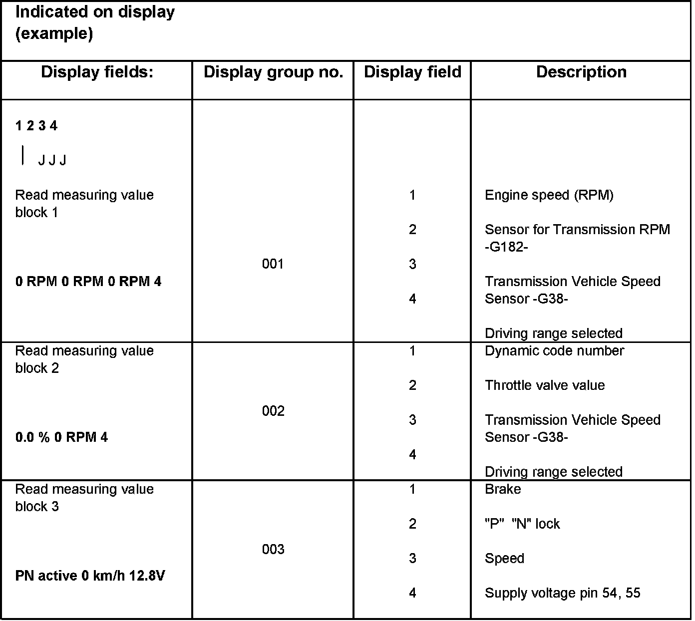 - Explanation of values in the individual display fields Test table. Evaluating Measured Value Blocks -E17-