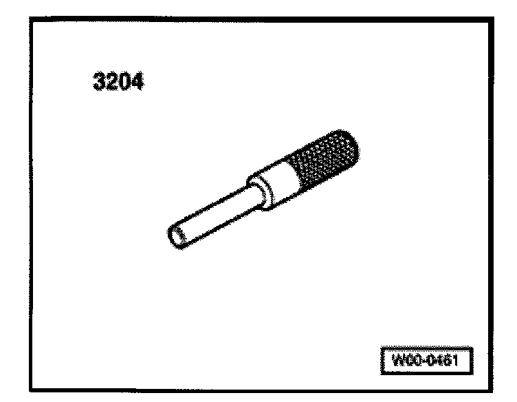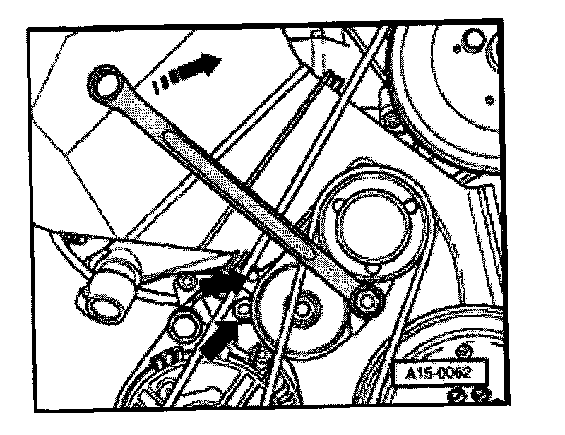 - Rotate tensioner for ribbed belt toward right using box wrench until both holes are in alignment (lower arrows), and secure in place using 3204 drift.