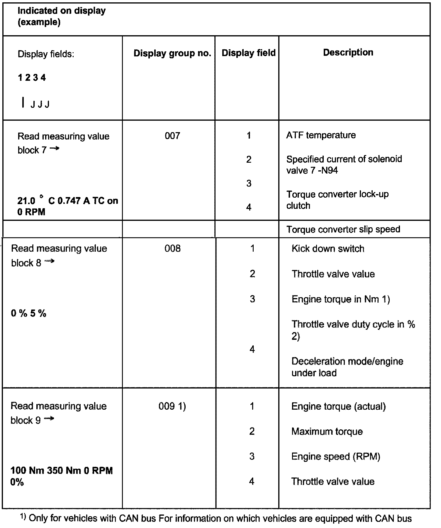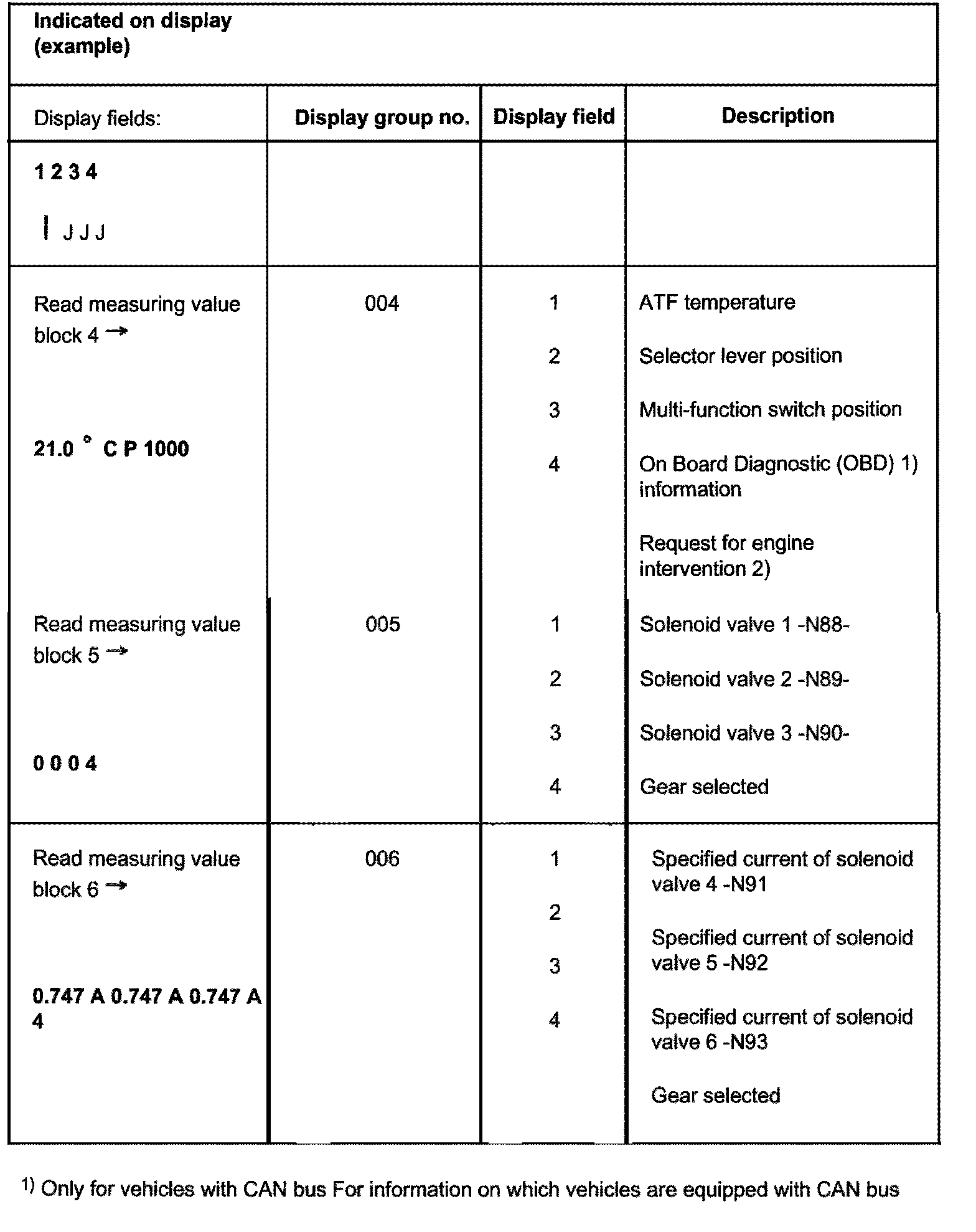 1) Only for vehicles with CAN bus. For information on which vehicles are equipped with CAN bus refer to Transmission and Drivetrain; Automatic Transmission/Transaxle.