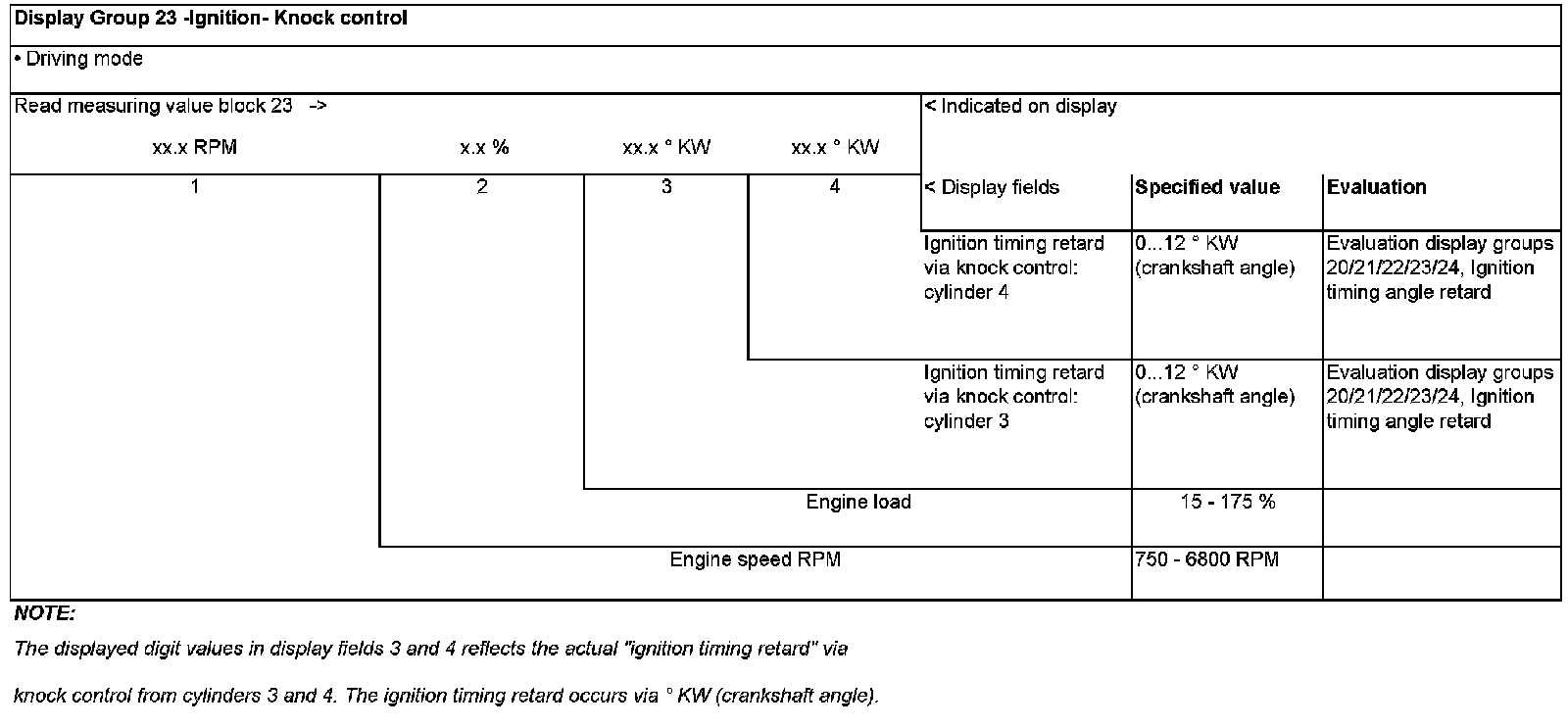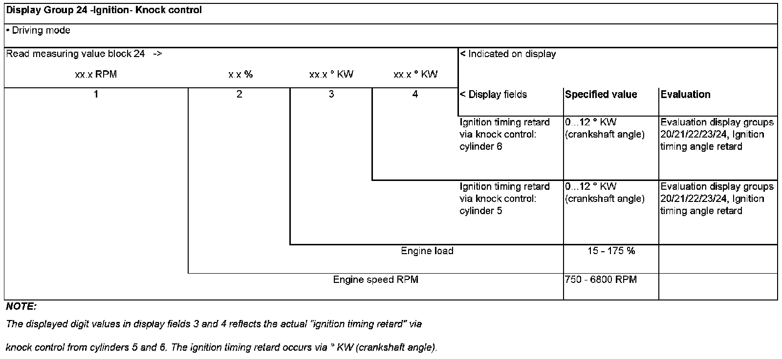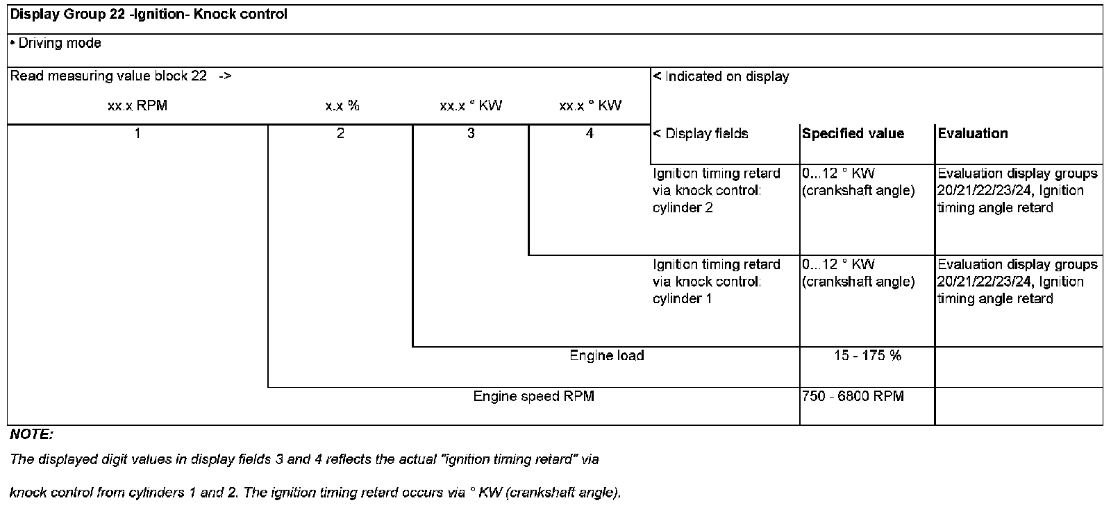 Evaluation display groups 20/21/22/23/24, - Ignition timing angle retard