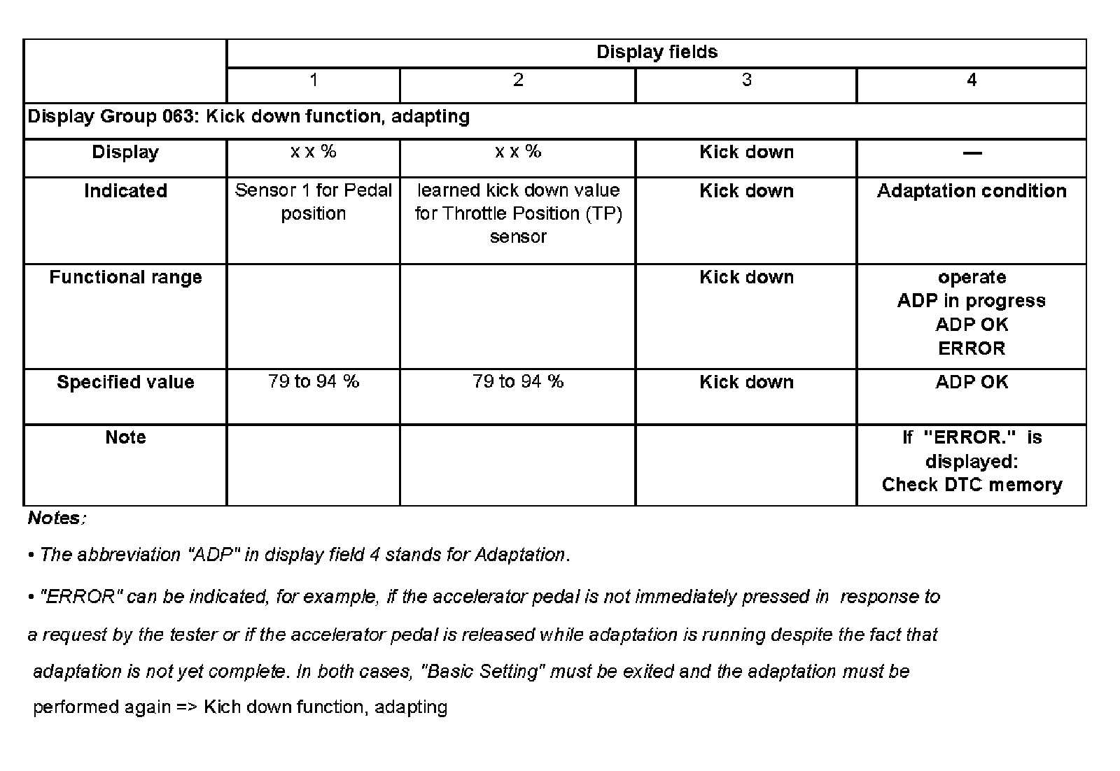 NOTE: During adaptation of the kick down point, "kick down ADP in progress" will be indicated in display. After successful adaptation of the kick down point, "kick down ADP OK" will be indicated on display.