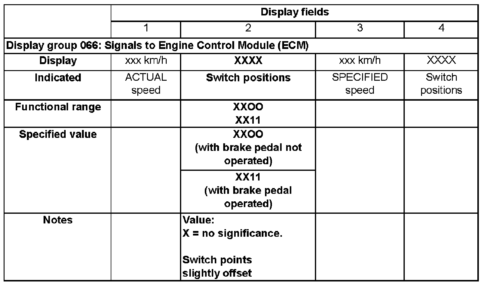 If brake pedal is operated with accelerator pedal constantly depressed, engine is immediately regulated down to idle speed. A faulty switch can lead to undesired regulation.