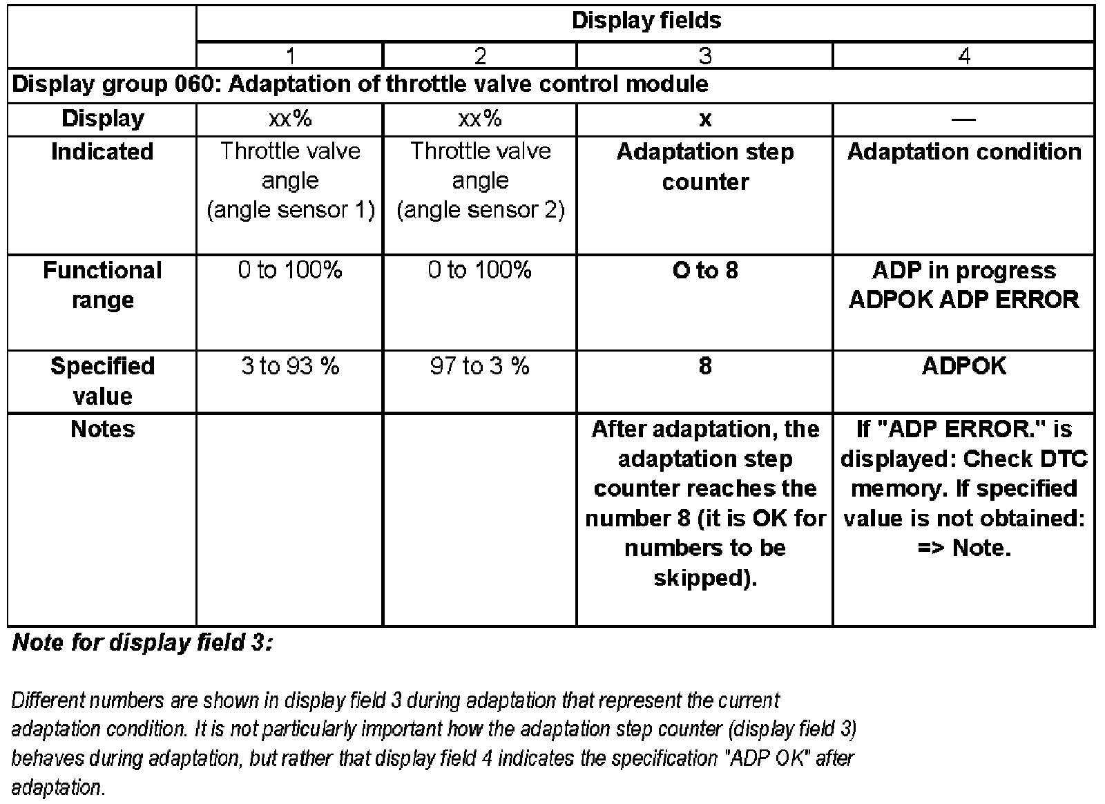 The adaptation teaches the Engine Control Module (ECM) various positions of the throttle valve when the ignition is on and the engine is stopped. These positions are stored in the control module The return communication regarding the position of the throttle valve occurs via the two angle sensors for throttle drive.