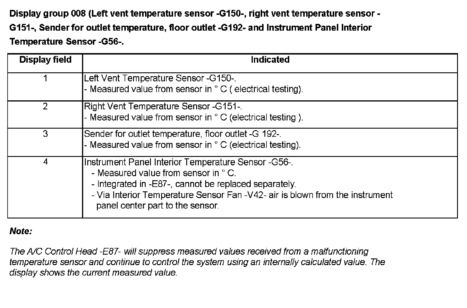 Display Group 008 (Left Vent Temperature Sensor -G150-, Right Vent Temperature Sensor -G151-, Sender For Outlet Temperature, Floor Outlet -G192- And Instrument Panel Interior Temperature Sensor -G56-.