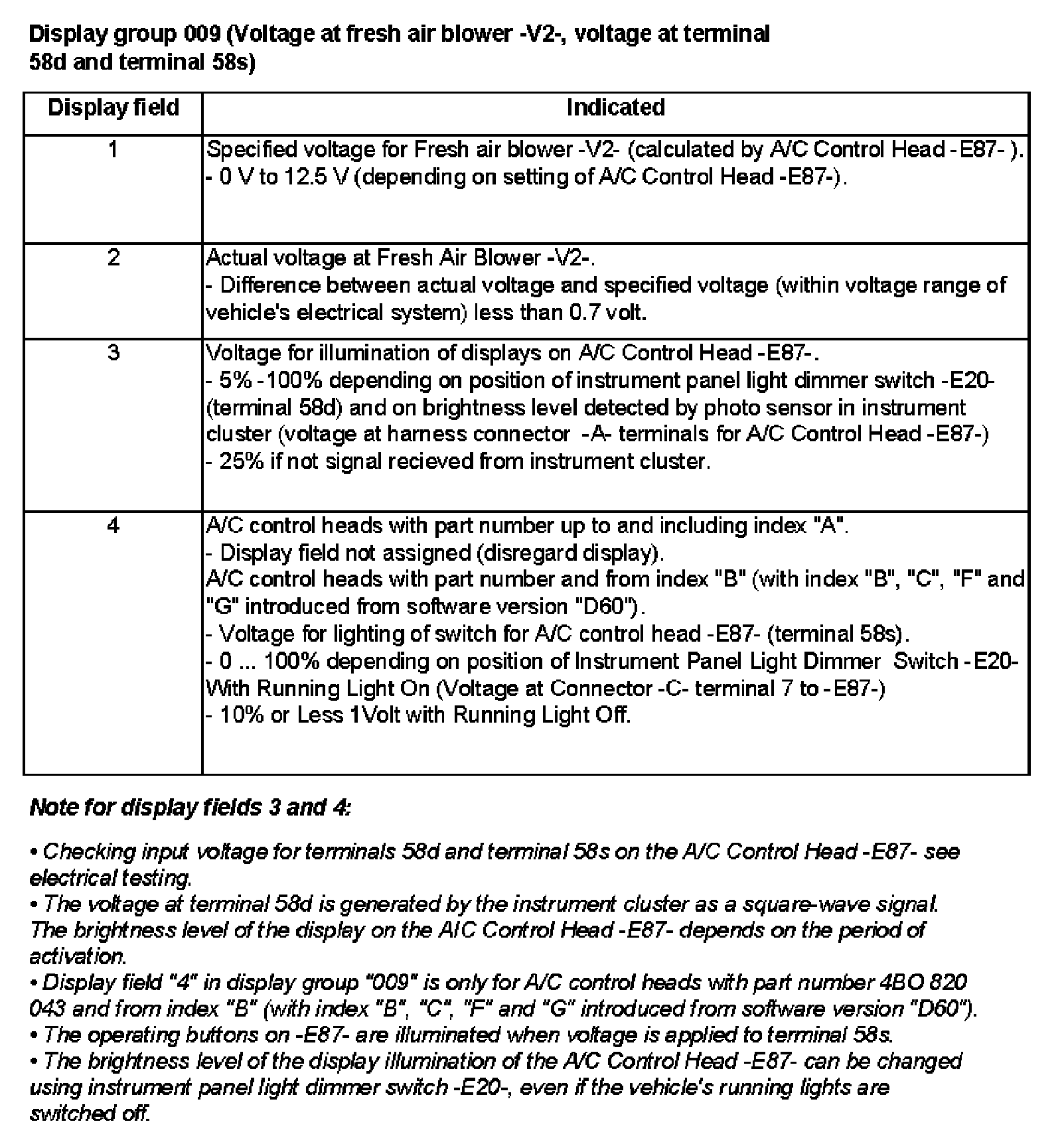 Display Group 009 (Voltage At Fresh Air Blower -V2-, Voltage At Terminal 58d And Terminal 58s)