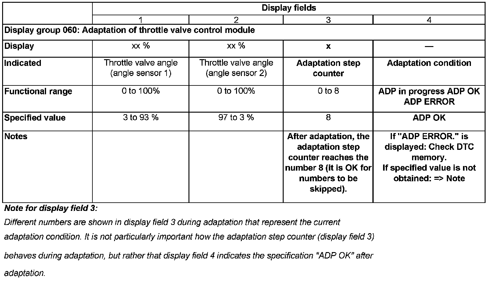 The adaptation teaches the Engine Control Module (ECM) various positions of the throttle valve when the ignition is on and the engine is stopped. These positions are stored in the control module The return communication regarding the position of the throttle valve occurs via the two angle sensors for throttle drive.
