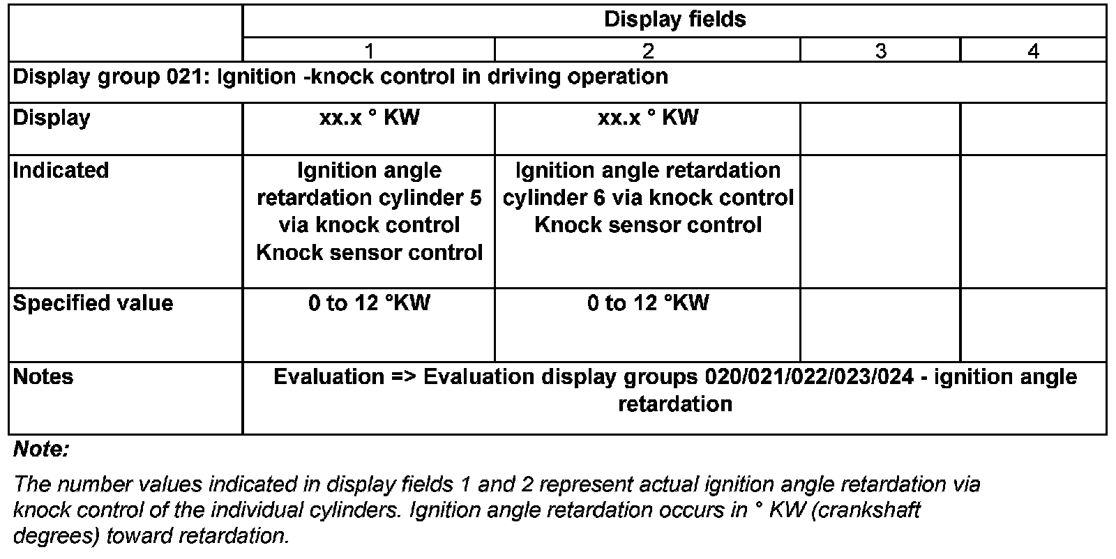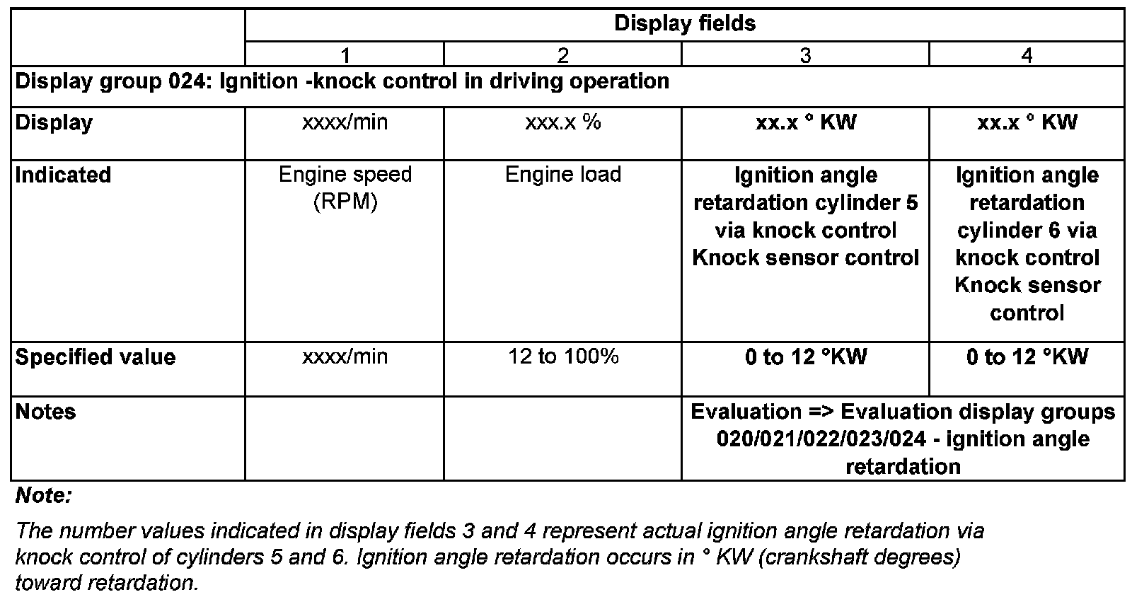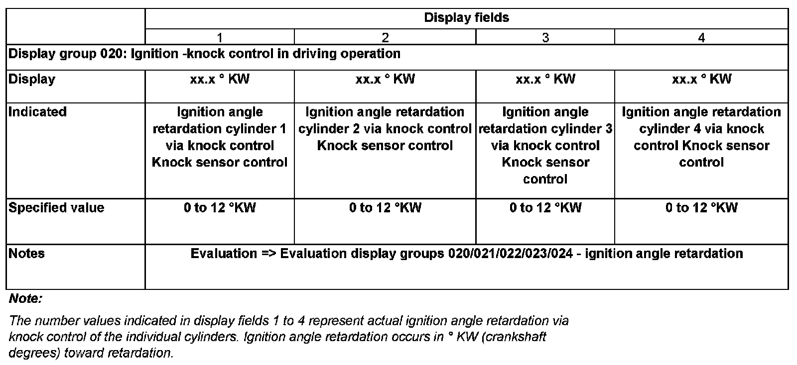 Evaluation display groups 020/021/022/023/024 - ignition angle retardation