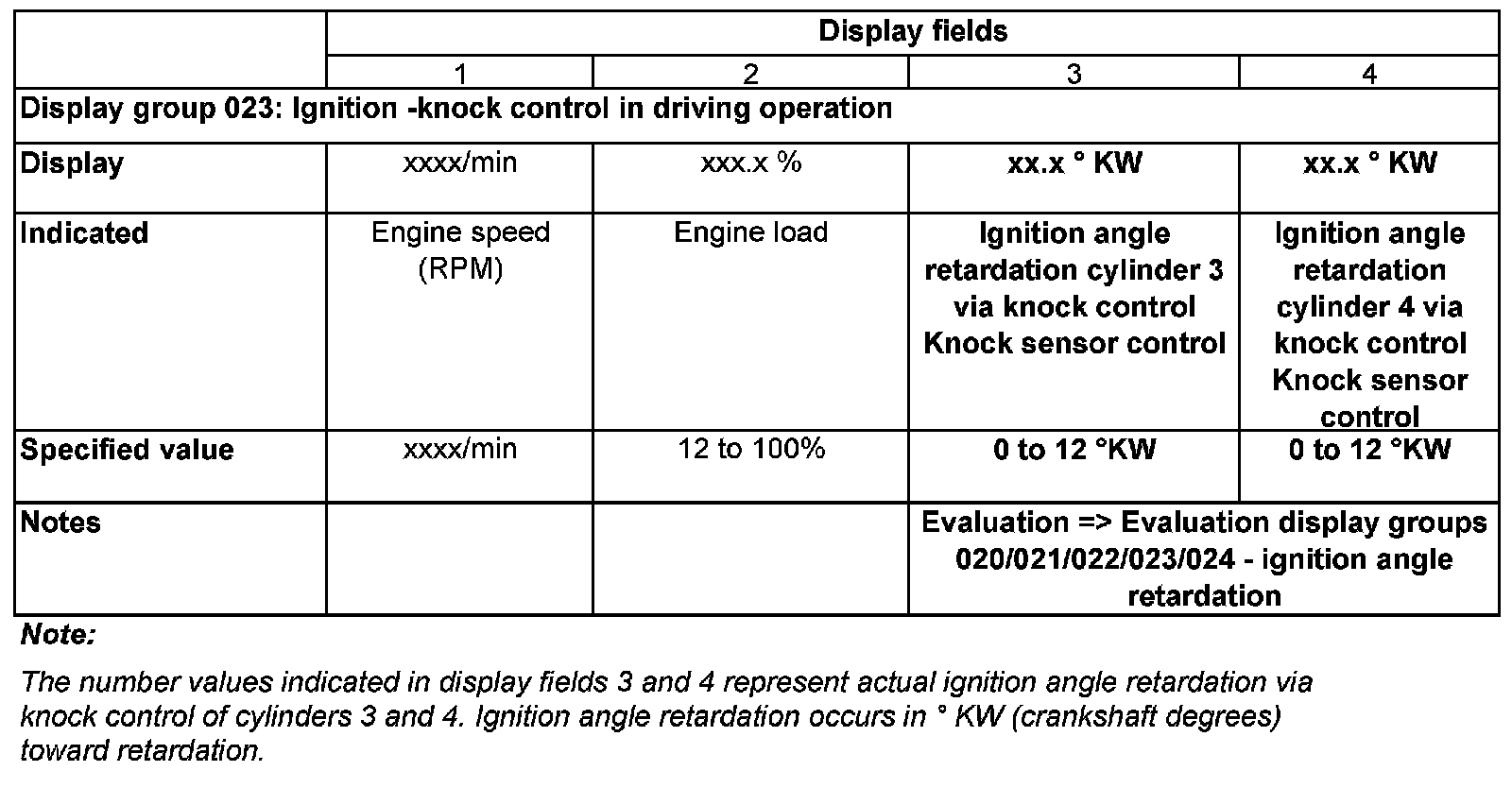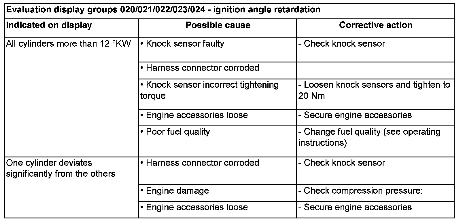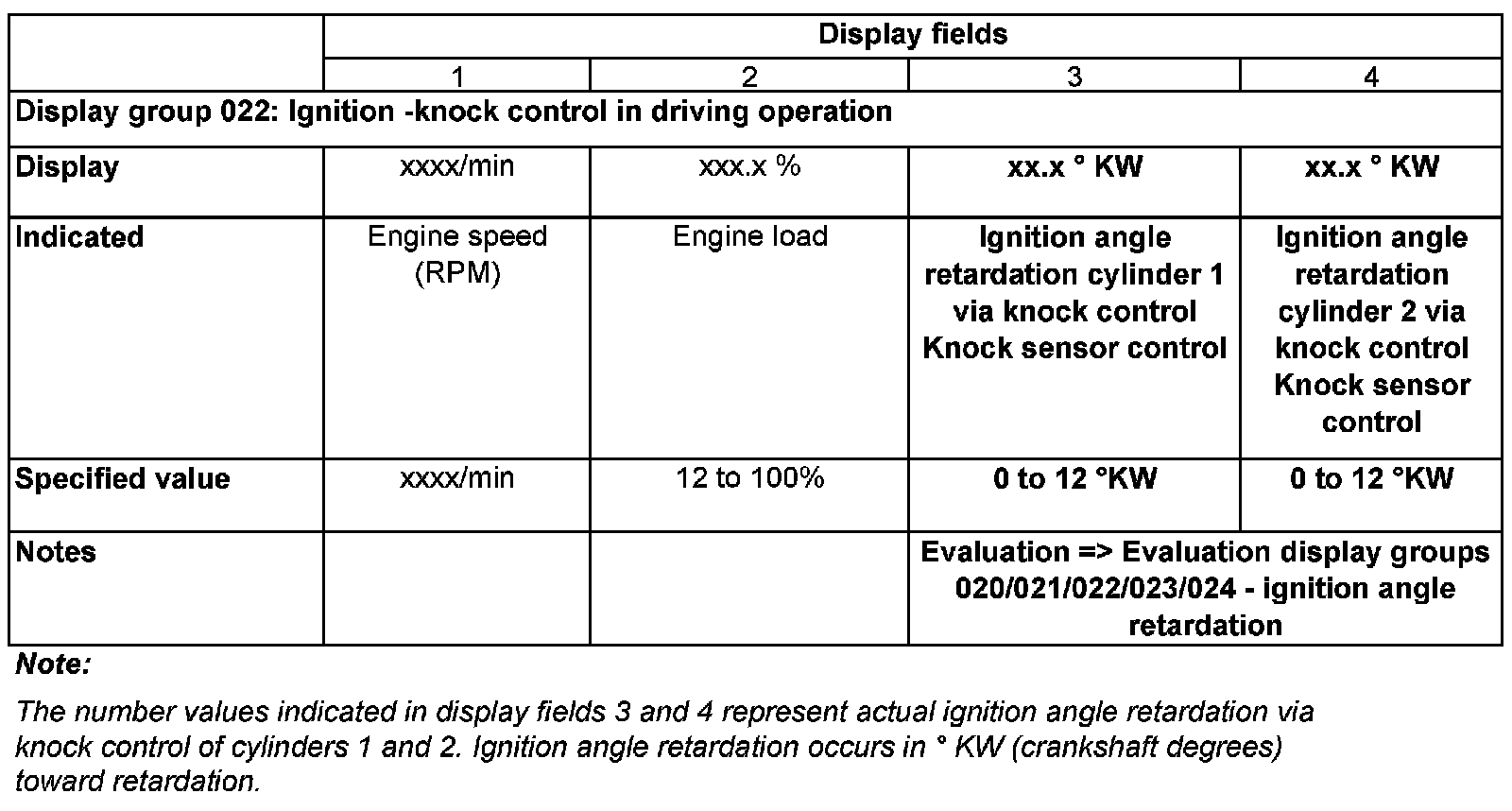 Evaluation display groups 020/021/022/023/024 - ignition angle retardation