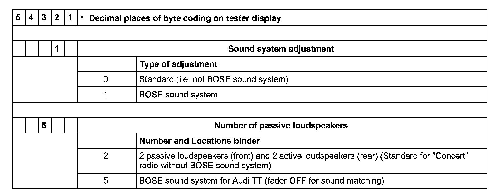 - Number of passive loudspeakers: 5 = BOSE sound system for Audi TT (fader OFF for sound matching)