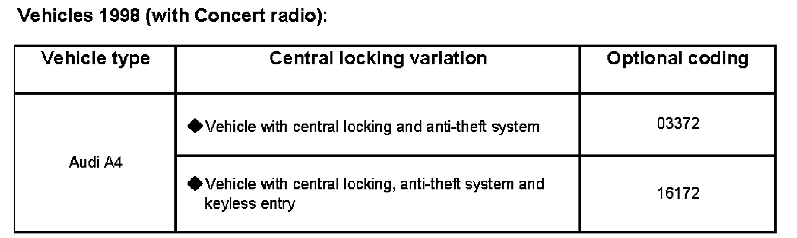 - Input coding of the central locking control module with keypad (e.g. 16140 for central locking with anti-theft/remote) vehicles 1998 >.