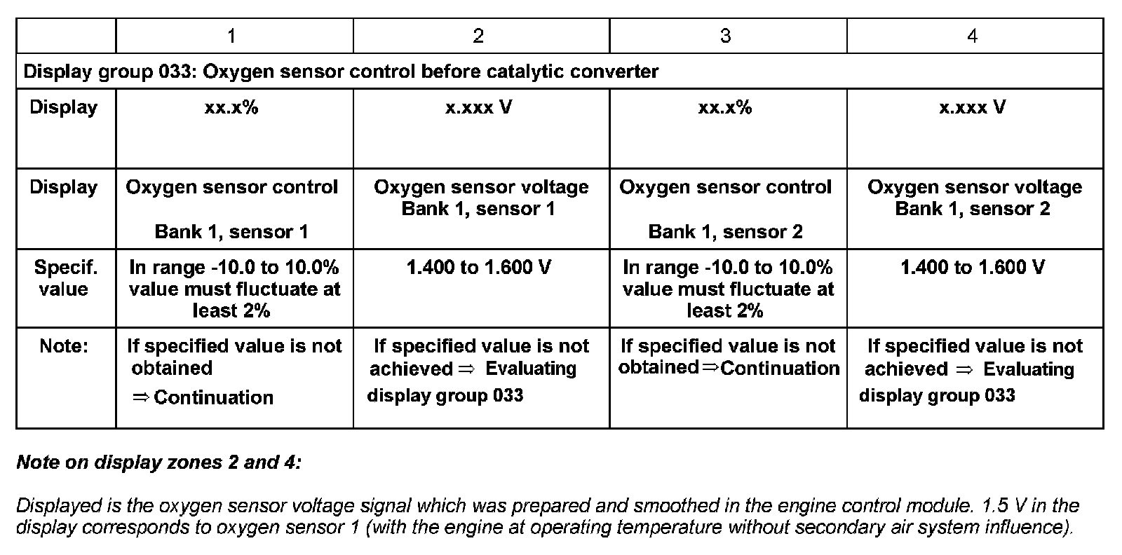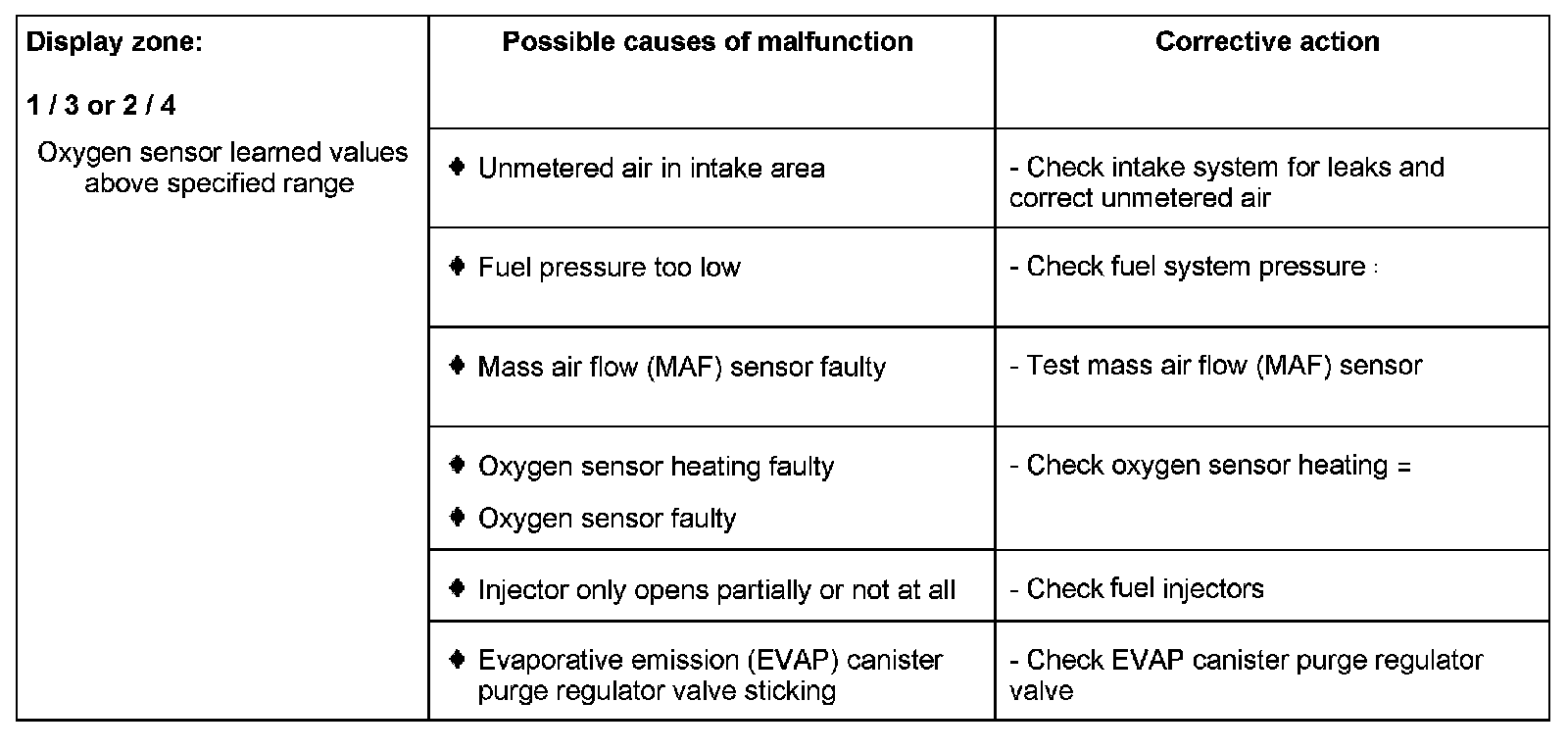If the specified result is not achieved in display zones 1 or 3, or if the value does not fluctuate by at least 2%, even after the test drive: