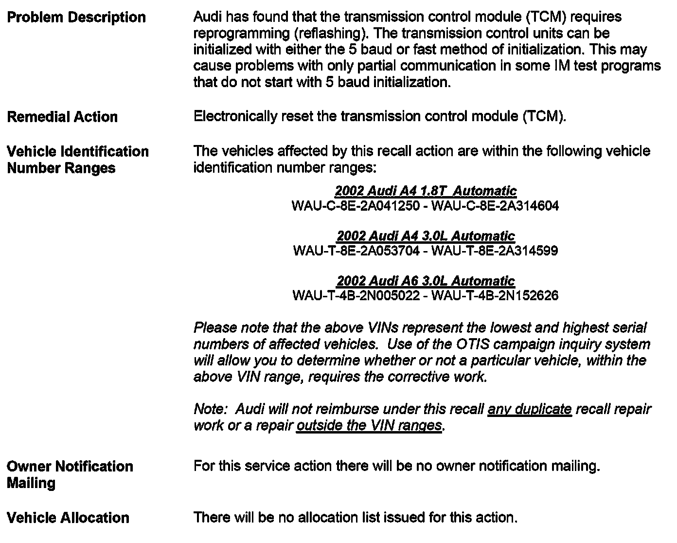 2002 Model Year Audi A4 and A6 3.0L Automatic Vehicles