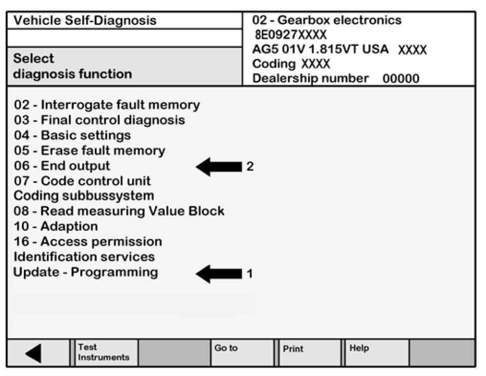 - Select Diagnosis function 06 "End Output" -arrow 2-