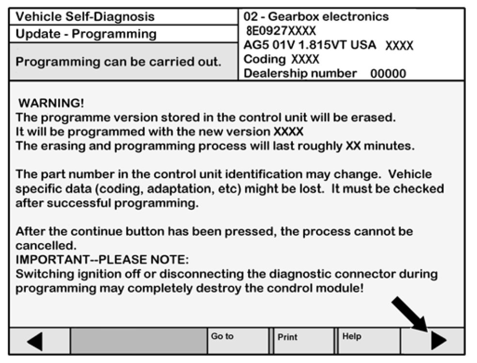 This procedure describes, "Update - Programming" (flashing) the transmission control module (TCM) in 2002 Audi A4 and A6 vehicles with a 5 speed tiptronic automatic transmission.