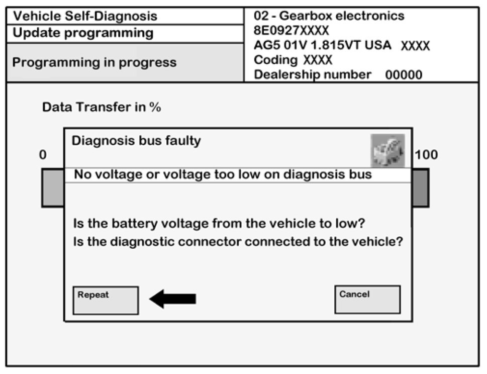 - The "Update - Programming" process must then be started from the beginning using the "Repeat" button -arrow-