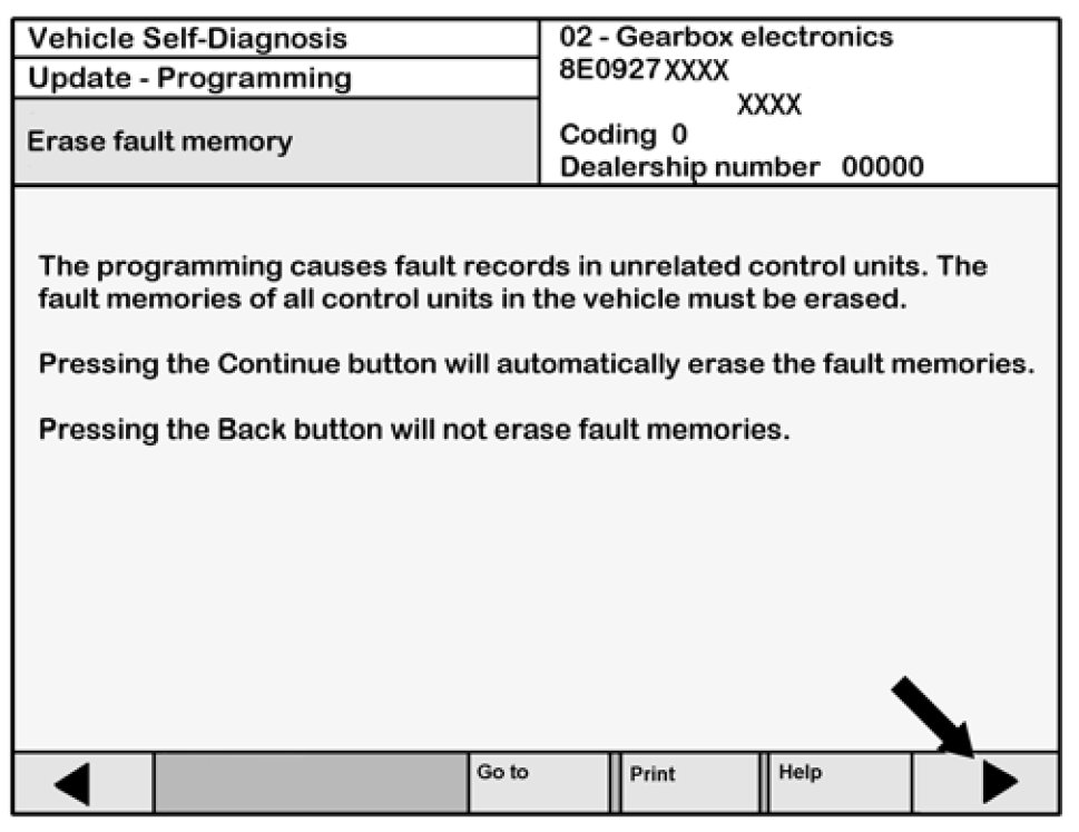NOTE: The old software level is still displayed -arrows-. The new software level is not displayed until the process is complete and fault memories have been erased.
