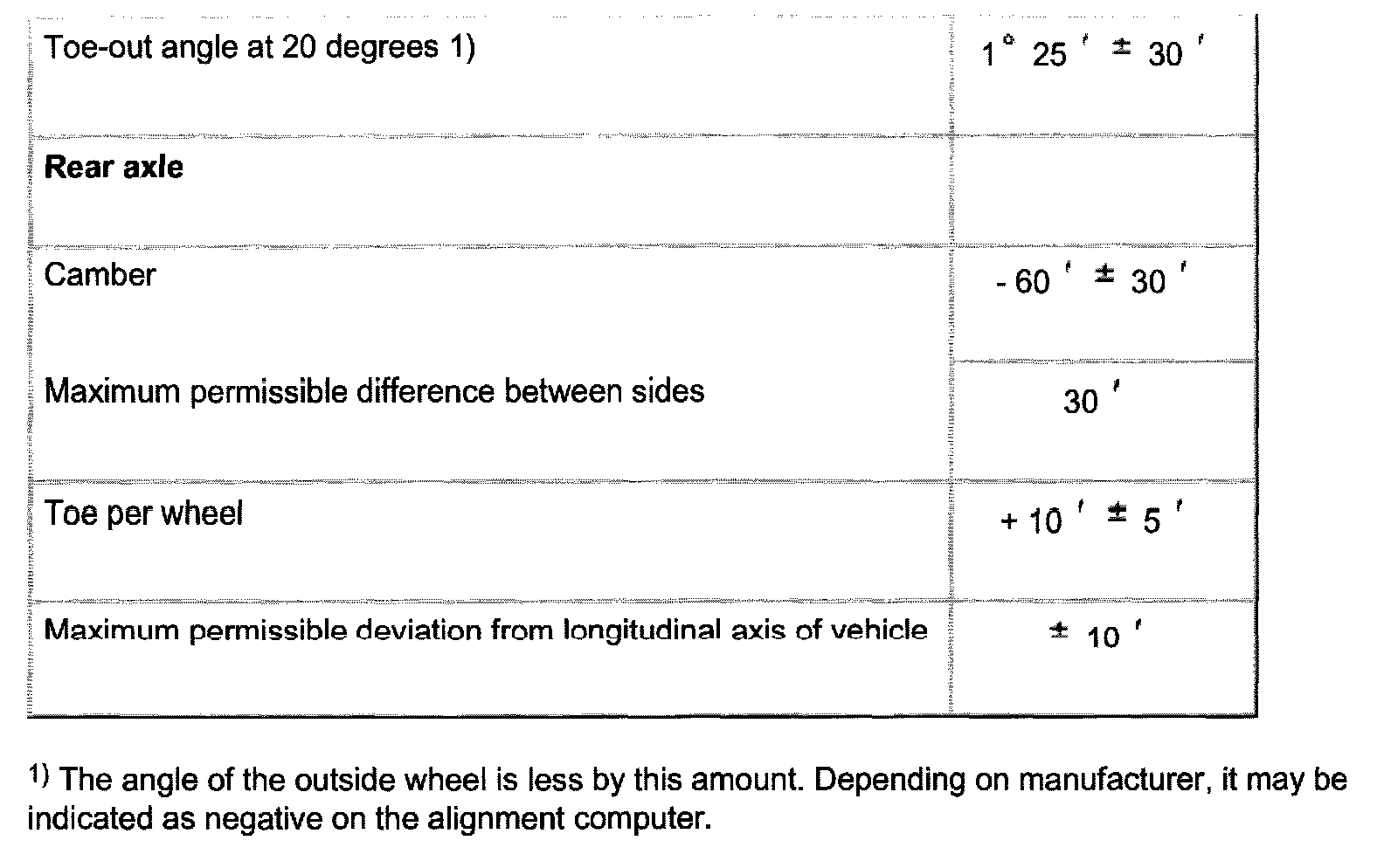Wheel alignment, expected values for front wheel drive vehicles