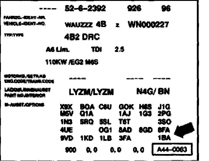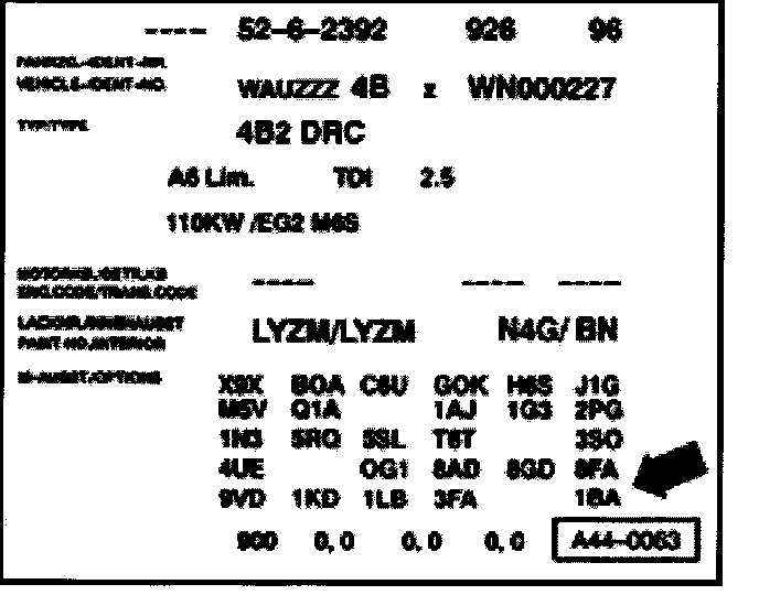 Running gear version fitted in vehicle is indicated by the factory weight code on the vehicle data plate (arrow).